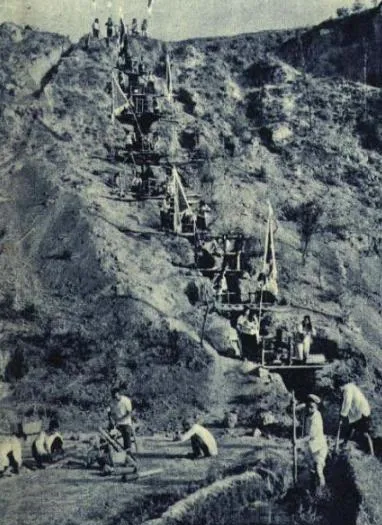 山坡上的这些家伙叫龙骨水车,一圈圈木轮子往下顺,人在上边使劲踩,下面农田顺着车子流下水,小时候赶上夏天干旱,这水车一刻都不敢停,村里大人小孩都围着转,说起来机器灌溉现在普遍了,那个齿轮转动的嘎吱声,一夜听下来反而能睡得踏实。