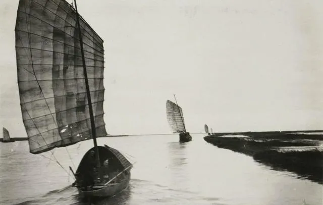 这水面上的风帆,就是鄱阳湖上赶生意的货船,用青色粗布拼的大帆迎风一晃一晃,船工站在舱头,喊号子拉桅索,遇上湖里涨水,船只挤成一团,风大时看着帆都快贴水了。现在要想再见这一排古船队,可能只在书里画册里找得着。