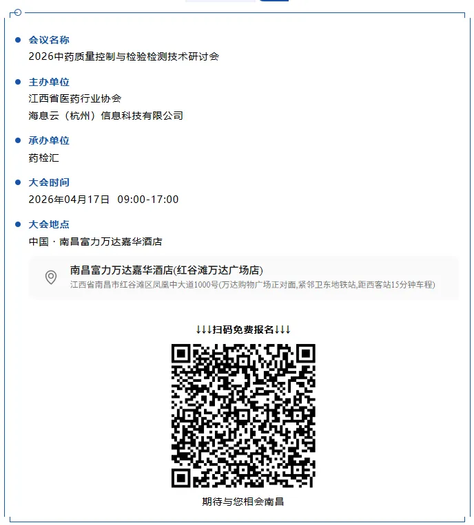 中医药作为国家战略的重要组成部分,正迎来高质量发展的关键期。随着《中国药典》标准的逐年提升以及全社会对药品安全关注度的日益增强,中药质量控制与检验技术面临着前所未有的挑战与机遇。从中药材的源头种植、内源性有毒有害物质的管控,到中药饮片的炮制工艺稳定性,再到中成药复杂体系的多指标成分分析,传统的检验模式已难以满足全周期精准质控的需求。 在此背景下,如何将政策法规转化为企业的核心竞争力,已成为全行业共同面临的重大课题,为了进一步提升药企在中药的质量控制技术,助力我省中药产业高质量发展。由江西省医药行业协会和海息云(杭州)信息科技有限公司联合主办,药检汇承办的“2026中药质量控制与检验检测技术研讨会”将于2026年4月在南昌举行。