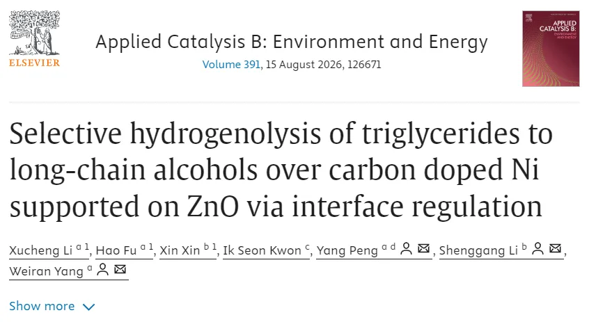 ACB | 南昌大学杨维冉&彭阳&李圣刚ACB:通过界面调控实现三酰甘油在碳掺杂镍/氧化锌催化剂上选择性氢解制长链醇!李旭成、傅浩、辛欣一作