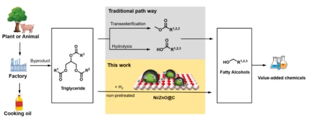 脂肪醇生产的商业化工艺采用两步法策略:首先将脂肪酸三酰甘油酯通过酯交换转化为脂肪酸酯,随后使用铜‑铬催化剂进行加氢。然而,商业铜‑铬催化剂需在苛刻的反应条件下运行,且因潜在的铬浸出风险而存在环境隐患。贵金属催化剂如钯、钌、铑等也能有效催化其加氢制脂肪醇,但其高昂成本使其经济吸引力较低。因此,非贵金属催化剂受到越来越多的关注,其中铜、镍、钴因其在相对温和的反应条件下表现出良好活性而备受瞩目。例如,有研究报道了一种富含缺陷的催化剂,其利用高分散的零价铜物种与丰富氧空位的协同效应促进氢气异裂,从而促进其解离,在高温高压条件下实现了高收率的十六烷醇。然而,该催化剂不稳定,易发生铜物种团聚和积碳,导致其加氢性能下降。因此,在第二个循环中脂肪醇收率大幅降低。迄今为止,大多数研究集中于脂肪酸甲酯或脂肪酸的转化。相比之下,关于三酰甘油酯直接转化的研究,在催化剂设计、反应路径控制和机理理解方面仍探索不足,仅有的案例也仅限于使用其作为方法验证的底物。鉴于天然植物油主要以三酰甘油酯形式存在,从原子经济性和生产成本的角度出发,开发高效催化剂由其生产脂肪醇具有重要意义。