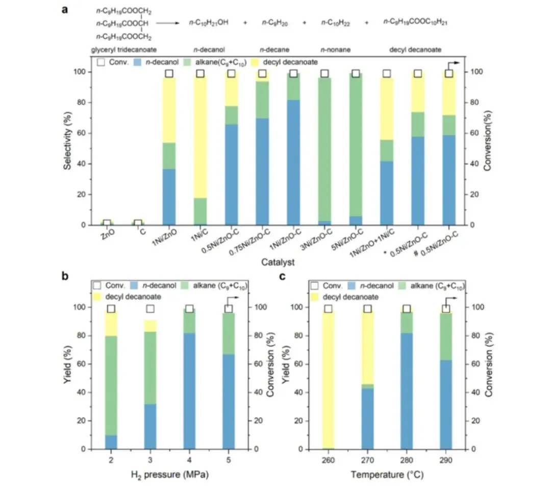 将非食用三酰甘油油转化为高价值化学品是可持续化学领域的关键研究方向。然而,未经预处理的三酰甘油直接转化以选择性制取长链脂肪醇,并抑制过度氢化,由于分子结构复杂及惰性的酯键存在,仍具挑战性。本研究通过在氧化锌载体上负载镍纳米粒子并随后掺杂活性炭,制备了碳掺杂的镍/氧化锌催化剂。该催化体系对三酰甘油的直接氢解脱氧反应表现出高活性,以82%的收率得到相应的脂肪醇。通过调控催化剂以暴露更多的镍‑氧化锌界面,实现了对脂肪醇的高选择性,该界面促进了氢气的异裂解离,产生优先氢化羰基并生成脂肪醇的氢物种。碳掺杂的引入减少了镍‑镍界面,提高了电子转移效率,并防止镍的流失,从而显著改善了催化活性和产物选择性。此外,工业级粗油脂也可作为脂肪醇生产的原料,并获得满意结果。这种具有高选择性和稳定性的三酰甘油直接转化制脂肪醇的创新催化体系具有巨大的工业应用潜力,并为未来理性催化剂设计提供了宝贵策略。
