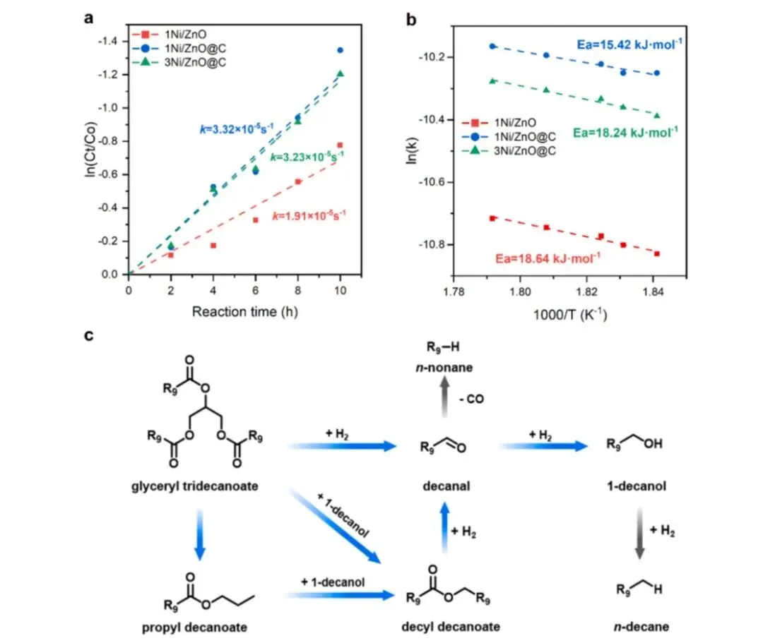 (a) 在几种催化剂上转化的动力学曲线;(b) 在几种催化剂上转化的表观活化能;(c) 甘油酯在催化剂上直接氢解脱氧的拟议反应网络。