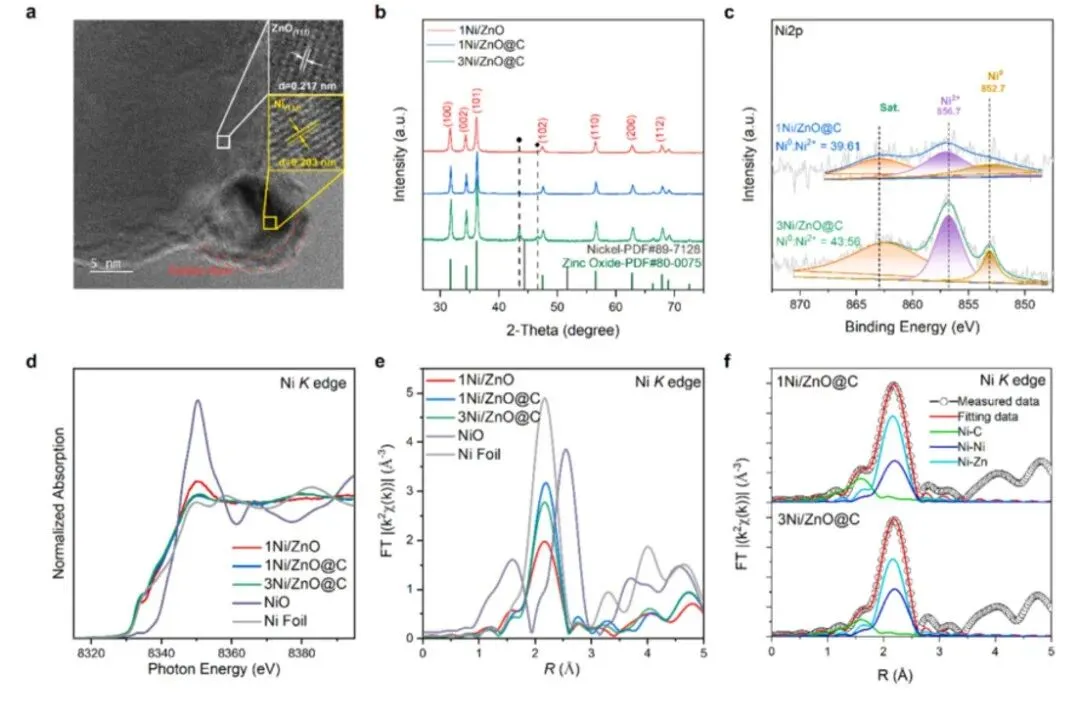 (a) 催化剂的透射电子显微镜图像;(b) 几种材料的X射线衍射谱;(c) 两种催化剂的X射线光电子能谱,基于峰面积量化了零价镍和镍离子的比例;(d) 几种材料的归一化镍K边X射线吸收近边结构谱;(e) 几种材料的扩展X射线吸收精细结构谱;(f) 两种催化剂的扩展X射线吸收精细结构谱的傅里叶变换及拟合曲线。