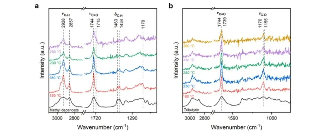图6. 底物在催化剂上不同温度下的原位傅里叶变换红外光谱