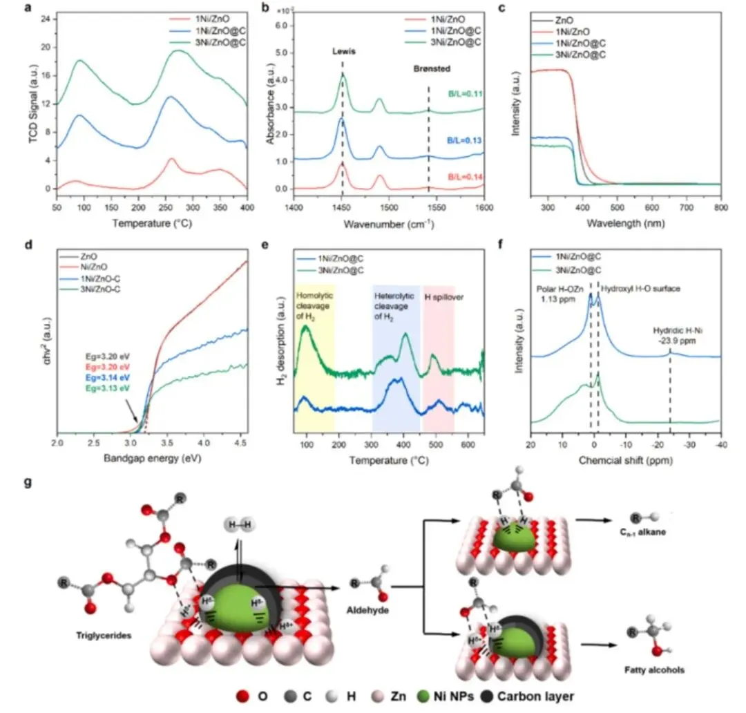(a) 几种催化剂的氨程序升温脱附谱;(b) 几种催化剂的吡啶吸附傅里叶变换红外光谱;(c) 几种材料的紫外‑可见漫反射光谱;(d) 几种材料的Tauc曲线图;(e) 两种催化剂的氢气程序升温脱附谱;(f) 反应后两种催化剂的固态核磁共振谱;(g) 甘油酯在催化剂上选择性生成脂肪醇或烷烃的氢解脱氧反应机理。