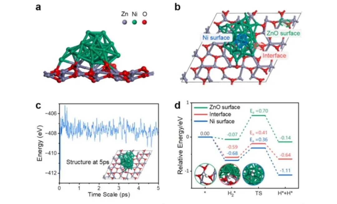 • 碳掺杂减少了镍‑镍界面,暴露出更多镍‑氧化锌界面,促进了氢气的异裂解离。