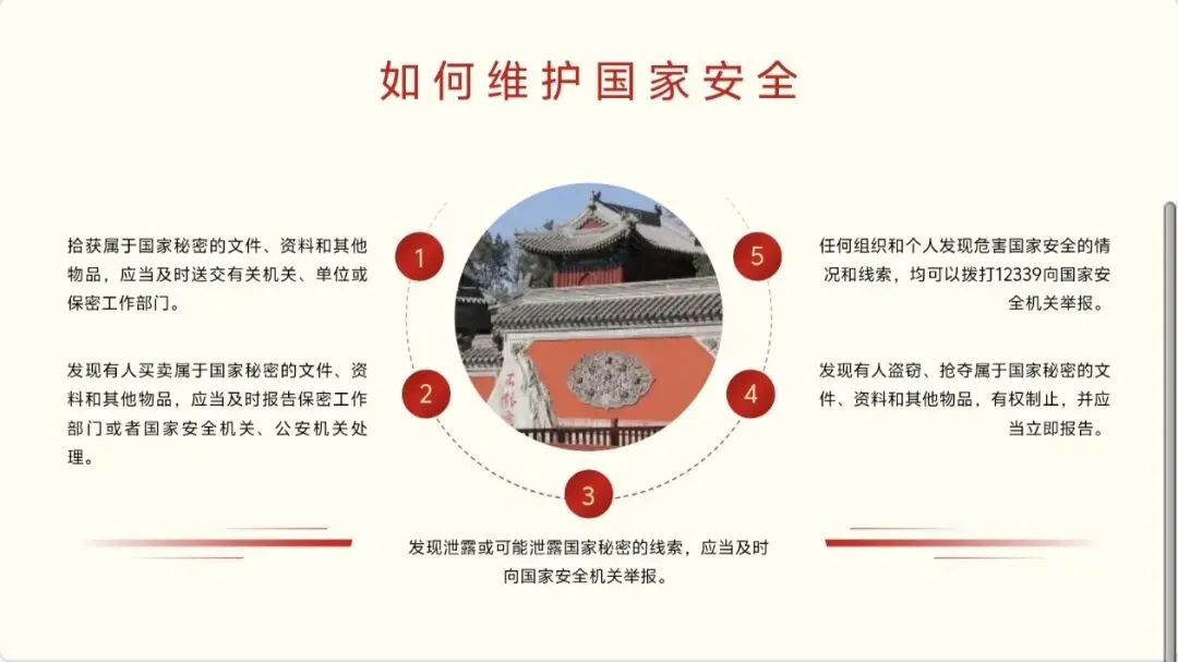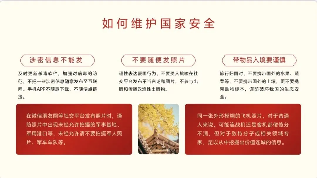 结合小学生日常行为,晨会重点讲解了维护国家安全的具体做法:规范使用网络,不随意泄露涉密信息;不拍摄、不传播军事设施、军人、军车等相关内容;理性爱国,不发布、不转发不当言论;出入境不携带违禁动植物、土壤等,守护生态安全;发现危害国家安全的线索,及时拨打12339举报电话。