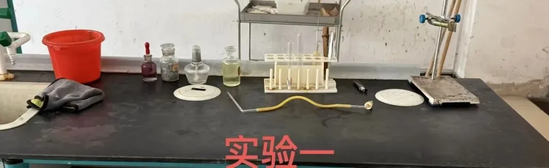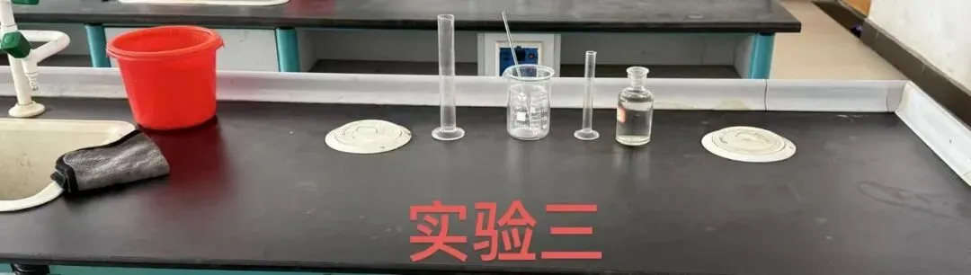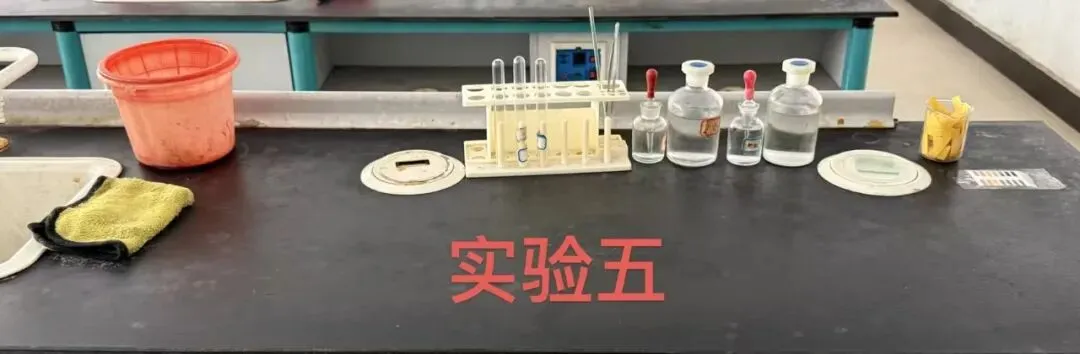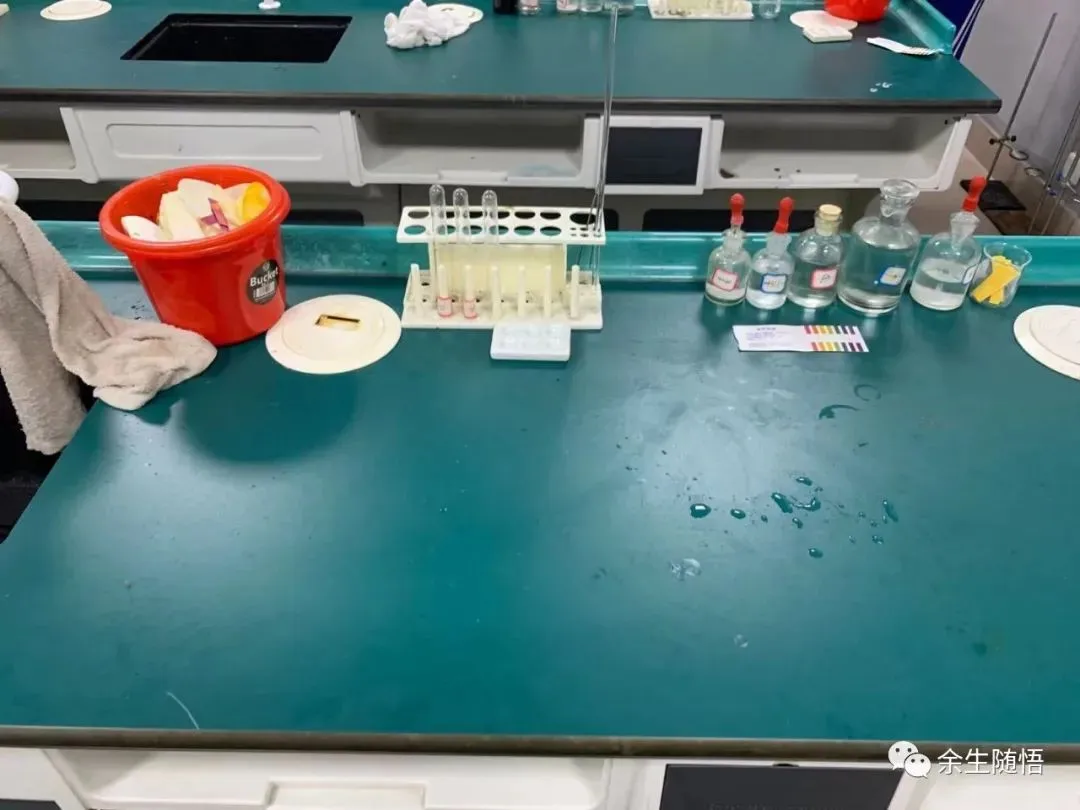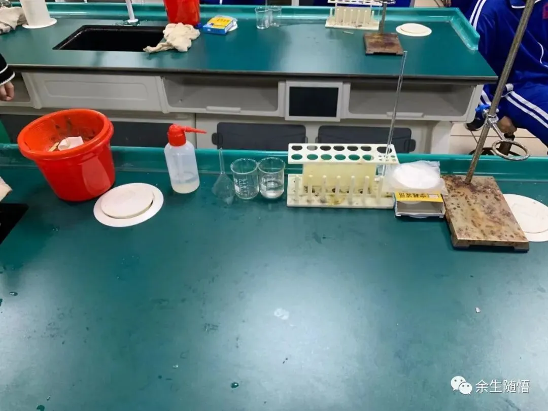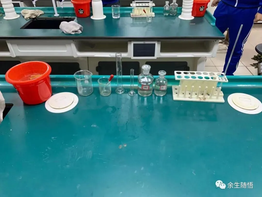应尽可能严格按照本文所示照片摆放实验仪器药品和用品,没有水池和水龙头可以用一个装有一定水的水盆代替(可以准备一些水在瓶子中代替水龙头放水);