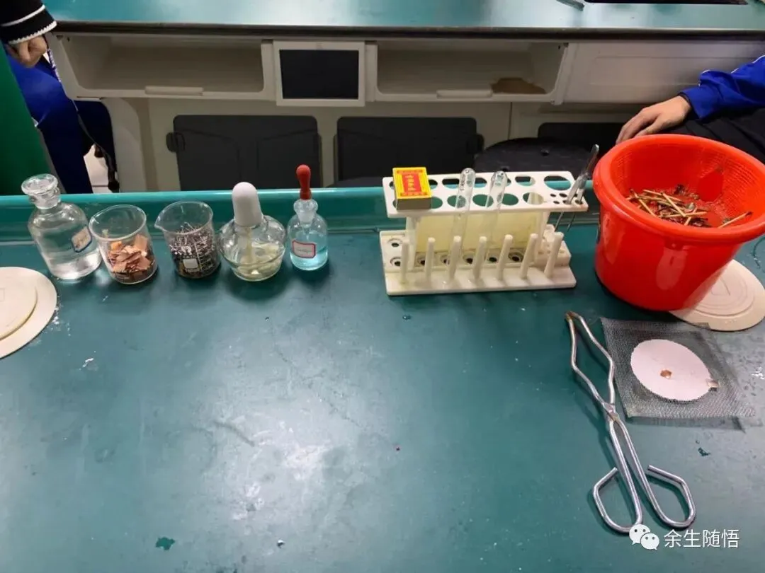 坩埚钳或大镊子、酒精灯、火柴、试管两只、镊子、试管刷,试管架、石棉网(陶土网)、废液缸、抹布;铁钉(烧杯中)、铜片(烧杯中)、硫酸铜溶液(滴瓶中)、稀盐酸(细口瓶中)