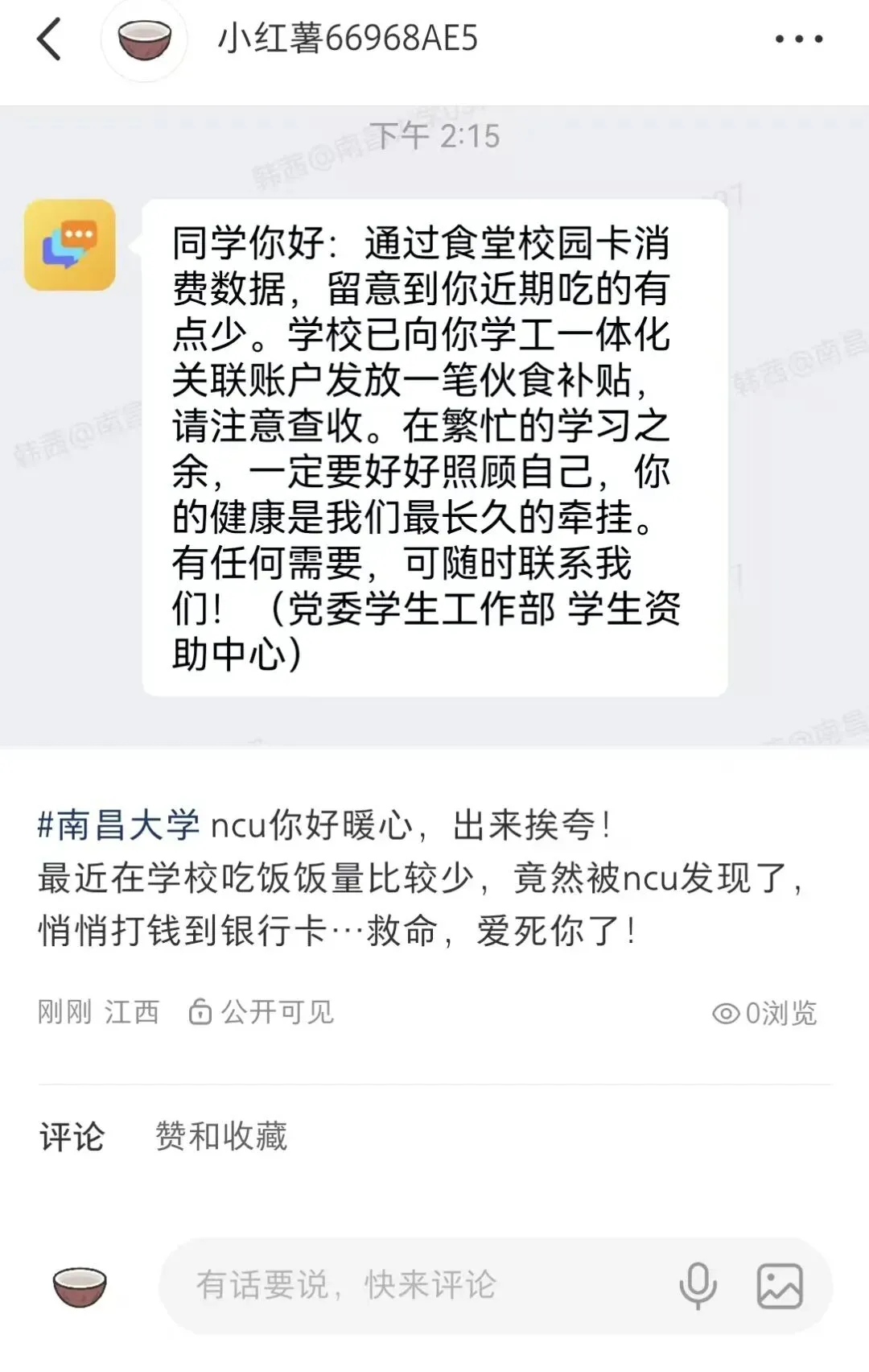 无需申请,没有公示!南昌大学为食堂消费少学生发伙食补贴,补助分三档,600元、500元、400元,面向全校本科生,会先让辅导员核实情况