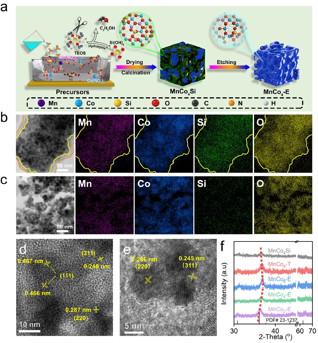 图1:(a) MnCo4-E合成过程的示意图。(b) MnCo4Si和(c) MnCo4-E的TEM图像及相应的元素分布图。(d) MnCo4-E和(e) MnCo4Si的HRTEM图像。(f) MnCo4Si、MnCo4-T以及不同Mn/Co比例的MnCox-E的XRD图谱。