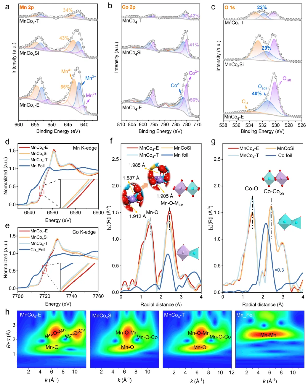 图2:不同催化剂的(a) Mn 2p、(b) Co 2p和(c) O 1s XPS谱图。不同催化剂的归一化(d) Mn和(e) Co K边XANES谱图。不同催化剂的傅里叶变换(f) Mn和(g) Co K边EXAFS谱图。(h) 不同催化剂Mn K边EXAFS谱图的小波变换结果。