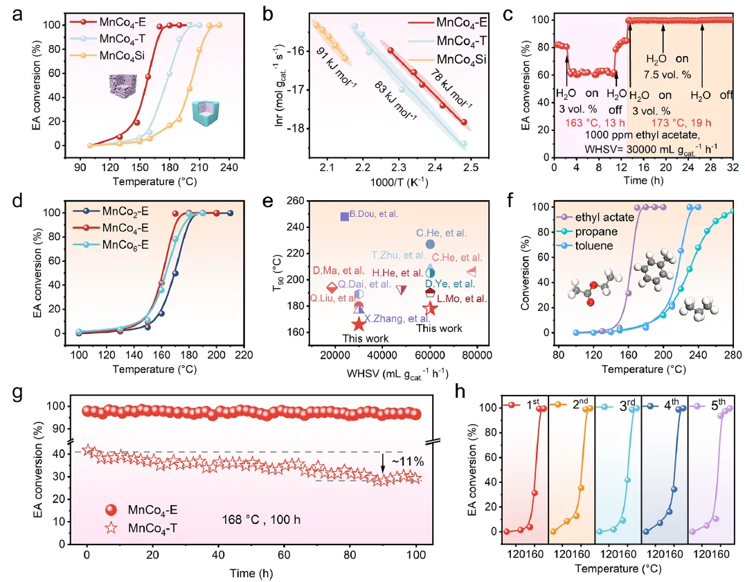 图3:(a) 不同催化剂对EA的催化氧化性能。(b) 相应的阿伦尼乌斯图。(c) 水蒸气对MnCo4-E催化EA转化率的影响。(d) 不同Mn/Co比例催化剂上EA的转化率。(e) 本工作合成催化剂与已报道催化剂的比活性对比。(f) 典型VOCs(EA、甲苯和丙烷)的转化率。(g) 长期稳定性测试。(h) 循环稳定性测试。反应条件:(a、d、g和h) 1000 ppm EA + 20% O2(N2平衡),WHSV= 30000 mL h-1 gcat.-1;(f) 2000 ppm C3H8 + 10% O2(N2平衡),WHSV = 36000 mL h-1gcat.-1;1000 ppm 甲苯 + 20% O2(N2平衡),WHSV = 36000 mL h-1 gcat.-1。