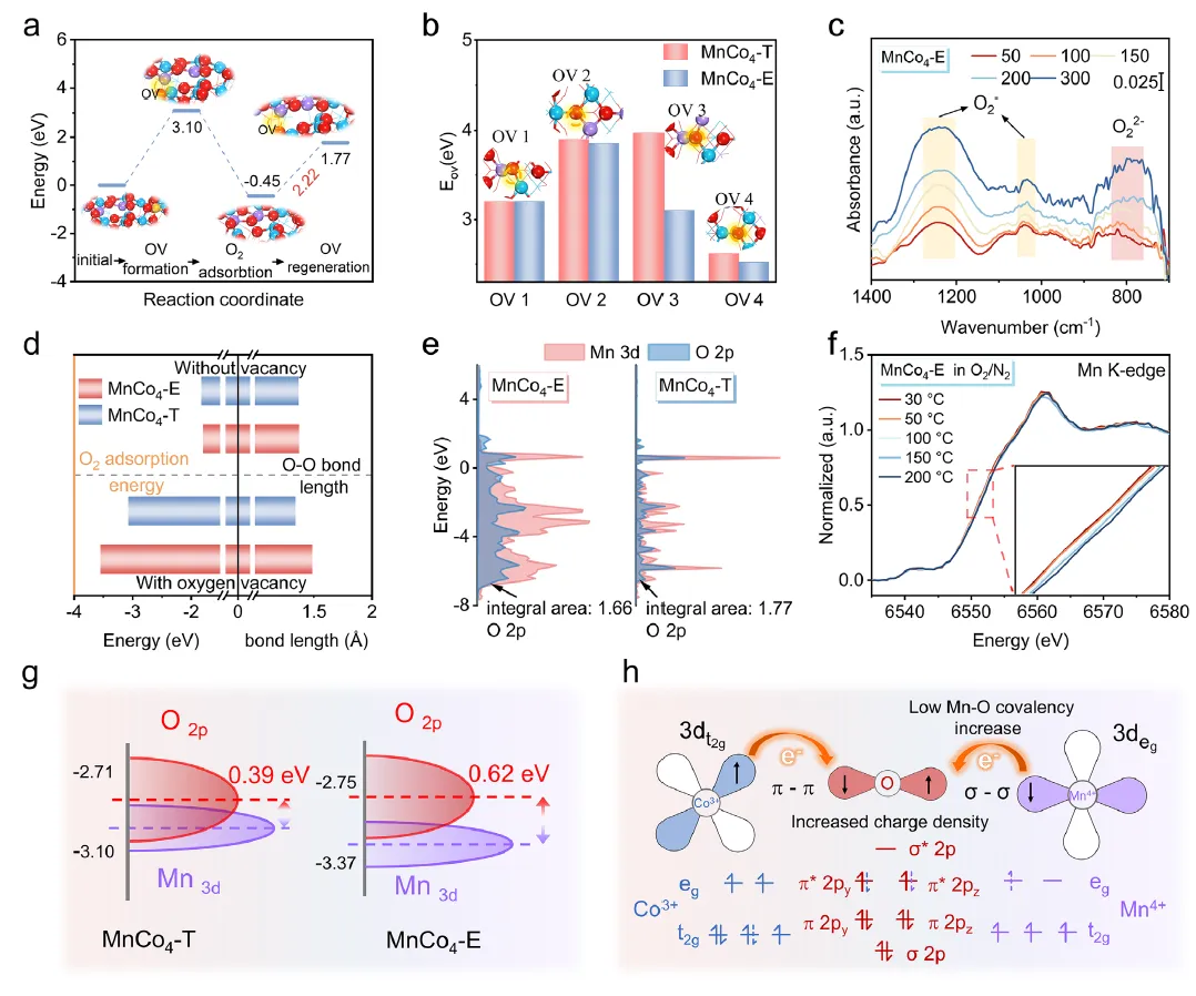 图4:(a) 氧空位形成及O2在氧空位上吸附的能级图。(b) DFT计算得到的MnCo4-E和MnCo4-T中不同位点的氧空位形成能。(c) MnCo4-E在20% O2/N2气氛下不同温度的O2吸附原位DRIFTS。(d) 有无氧空位条件下,MnCo4-E和MnCo4-T的O2吸附能及相应的O-O键长。(e) MnCo4-E和MnCo4-T中O和Mn的部分态密度。(f) O2/N2气氛下从30°C至200°C的原位归一化Mn K边XANES谱图。(g) MnCo4-T和MnCo4-E能带结构示意图。(h) MnCo4-E通过调控Mn-O共价性增强氧活化能力的机制示意图。