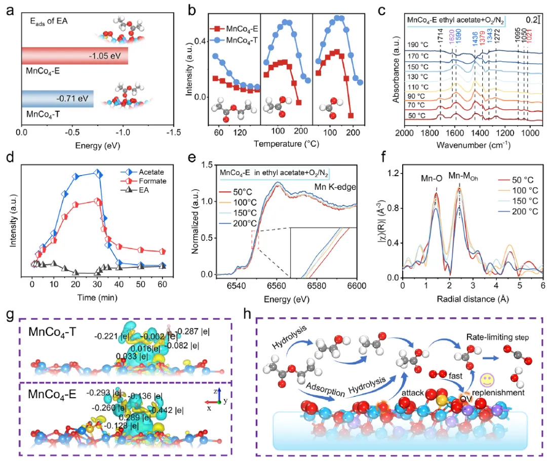 图5:(a) EA分子在MnCo4-E和MnCo4-T上的优化吸附能。(b) N2气氛吸附和O2/N2气氛氧化过程中,EA、乙酸盐和甲酸盐随温度的演变。(c) MnCo4-E在O2/N2气氛中50°C至190°C下EA氧化的原位DRIFTS谱图。(d) 在170°C条件下,N2吸附和O2/N2氧化过程中MnCo4-E上EA、乙酸盐和甲酸盐随温度的演变。(e) 50°C至200°C范围内,MnCo4-E上EA氧化过程中归一化Mn K边XANES谱图及(f) EXAFS谱图。(g) MnCo4-T和MnCo4-E理论模型中EA的Bader电荷分析。(h) MnCo4-E上EA氧化反应的反应路径。