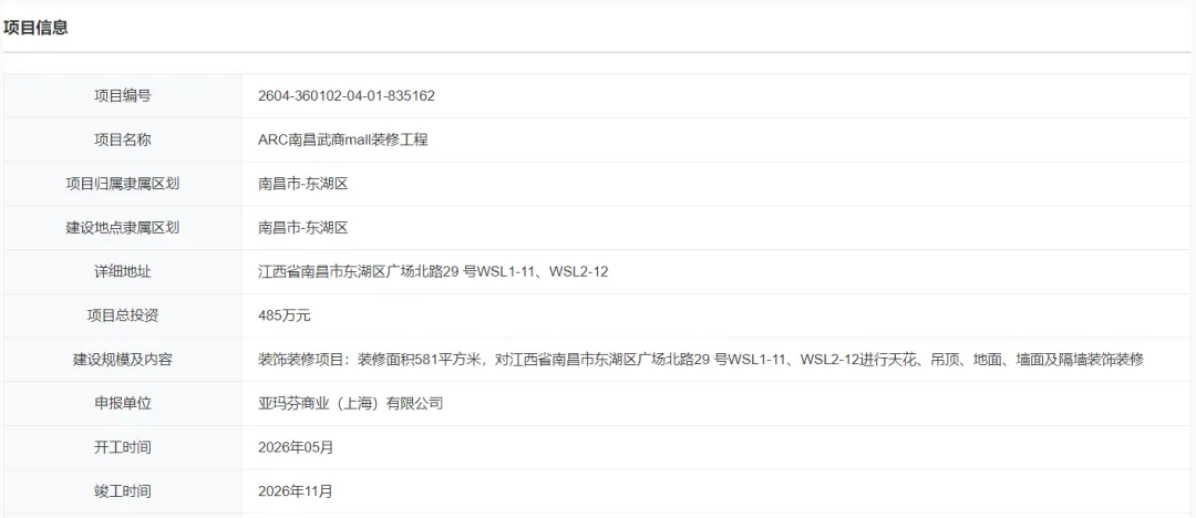 目前,相关部门终于发布了ARC南昌武商mall装修工程项目备案。
