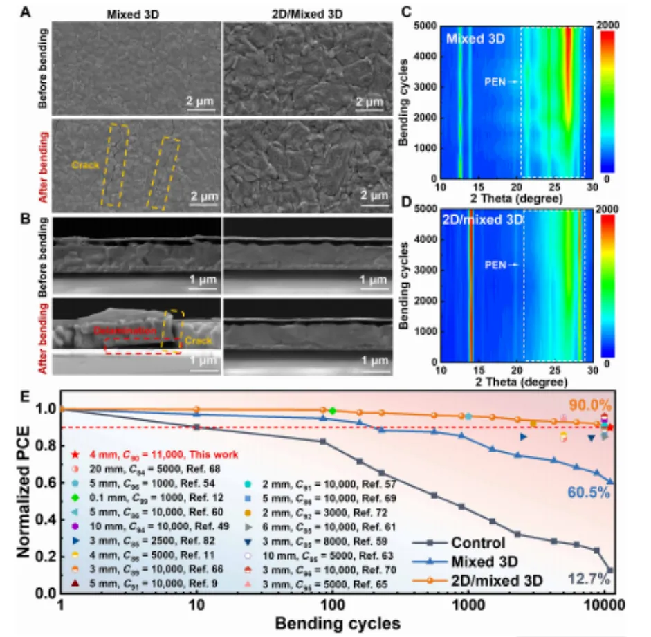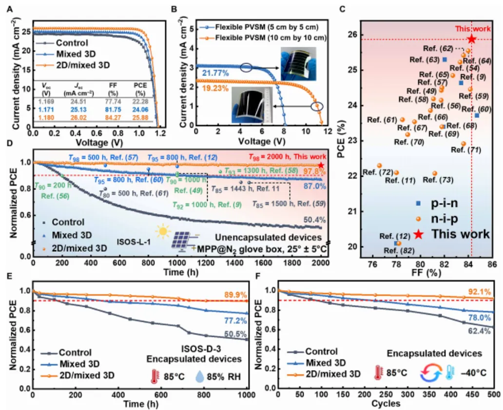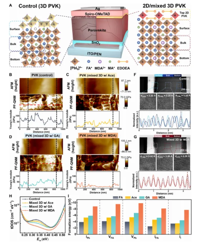 柔性钙钛矿太阳能电池(PVSCs)因其轻质和柔韧性,成为下一代光伏技术的有力候选者。然而,由非均匀A位掺杂引起的面外应变不均匀性以及富PbI₂表面产生的残余应力,限制了其长期稳定性和机械鲁棒性。鉴于此,南昌大学谈利承和陈义旺等人于《Science Advances》刊发了研究文章,证明优化A位掺杂可以降低缺陷密度和微应变,提高组分均匀性。面外应变的高级可视化揭示了应变均匀化的关键路径。此外,在富PbI₂表面原位形成的二维钙钛矿层有效释放了残余应力,促进了界面载流子传输,并增强了钙钛矿薄膜的机械性能。最终,我们在刚性和柔性PVSCs上分别实现了26.59%和25.88%(认证25.55%)的光电转换效率。此外,大面积柔性组件在25平方厘米和100平方厘米面积上分别获得了21.77%和19.23%的优异效率。未封装的柔性器件在2000小时最大功率点跟踪(ISOS-L-1)后仍保持初始效率的97.8%,同时在湿热、热循环和机械测试中表现出卓越的耐久性。1.通过优化MDA²⁺等A位阳离子掺杂,降低薄膜微应变和缺陷密度,实现了均匀的应力分布。2.利用二铵间隔阳离子(如EDOEA)与残余PbI₂原位反应,形成2D钙钛矿覆盖层,有效释放界面应力、增强机械韧性与载流子传输。3.基于上述策略,制备的刚性/柔性器件效率分别达26.59%和25.88%,并展现出卓越的长期运行、湿热、热循环及机械弯曲稳定性(>11,000次弯曲后效率>90%)。1.为柔性钙钛矿光伏的商业化提供了关键的应变工程与界面设计基础。2.使器件更适用于便携电源、可穿戴电子、建筑光伏等柔性应用场景。3.在探索更优材料组合、开发新型界面工程及实现更大面积、低成本制造方面仍有进一步优化空间。原文链接:https://www.science.org/doi/10.1126/sciadv.aec3238