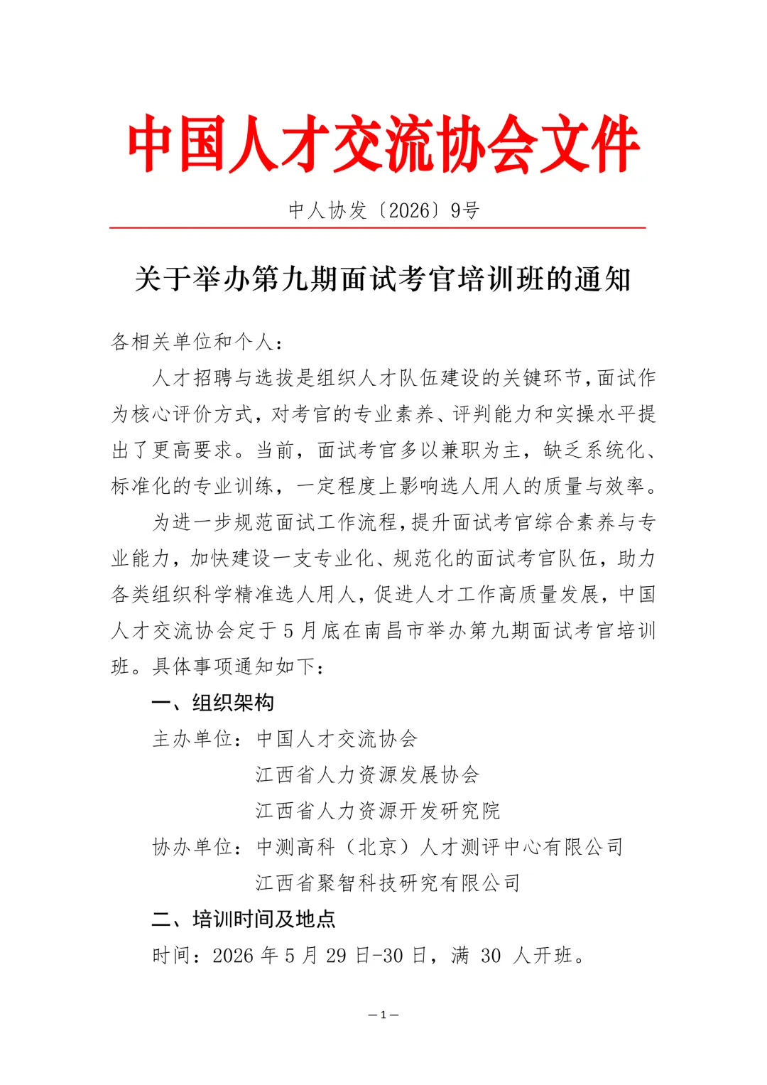 >关于举办第九期(南昌)面试考官培训班的通知