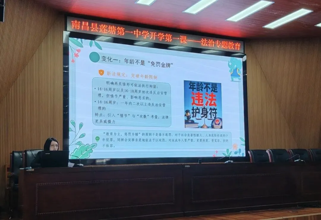 为深化青少年法治教育,筑牢校园安全防线,引导学生树立尊法学法守法用法意识,莲塘一中特邀法治副校长、南昌县人民检察院检察长刘龙军一行走进校园,开展法治专题教育讲座。