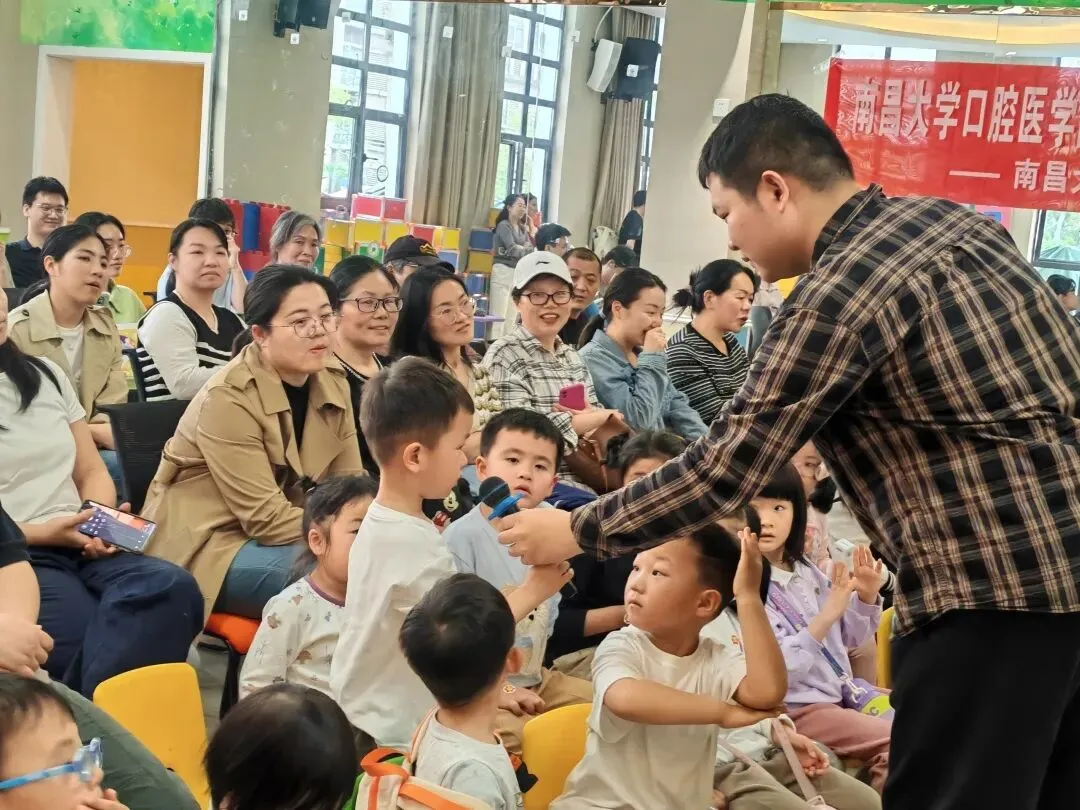 南昌大学口腔医学院医护团队以专业科普讲师身份,运用规范表述与直观教具,系统讲解牙齿结构、日常清洁、龋齿预防等核心知识,引导幼儿树立科学护牙观念。医护人员针对家长关注的儿童口腔护理、龋齿防控、饮食习惯等问题逐一答疑解惑,提供专业、规范的健康指导。互动环节中,幼儿踊跃举手,积极回答问题,现场氛围热烈。医护人员为积极参与的小朋友颁发小奖品,进一步激发幼儿爱牙护牙的热情。