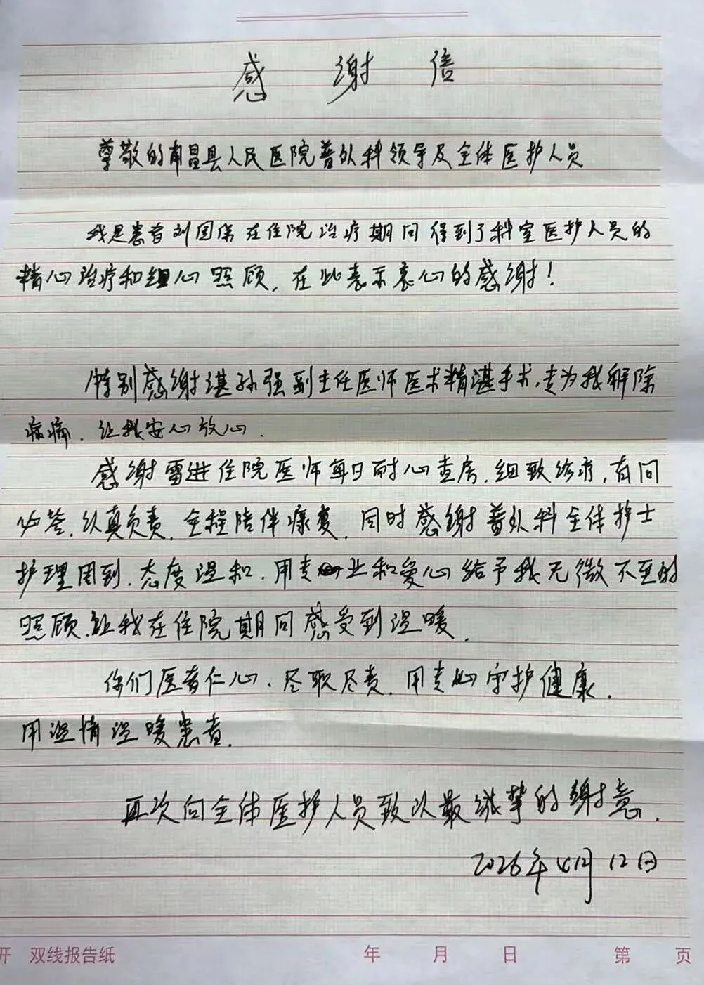 从术前的细致评估、方案制定,到术中的精准操作、全力以赴,再到术后的精心护理、暖心陪伴,普外科的医护人员用专业的医术、真诚的关怀,一点点化解了刘先生的焦虑,帮助他逐步摆脱病痛的困扰,平稳度过康复期。如今,刘先生恢复情况良好,已能正常生活,这份重生的喜悦,让他忍不住提笔写下感谢信,用最朴素的方式,表达对医护人员最深厚的敬意与感谢。