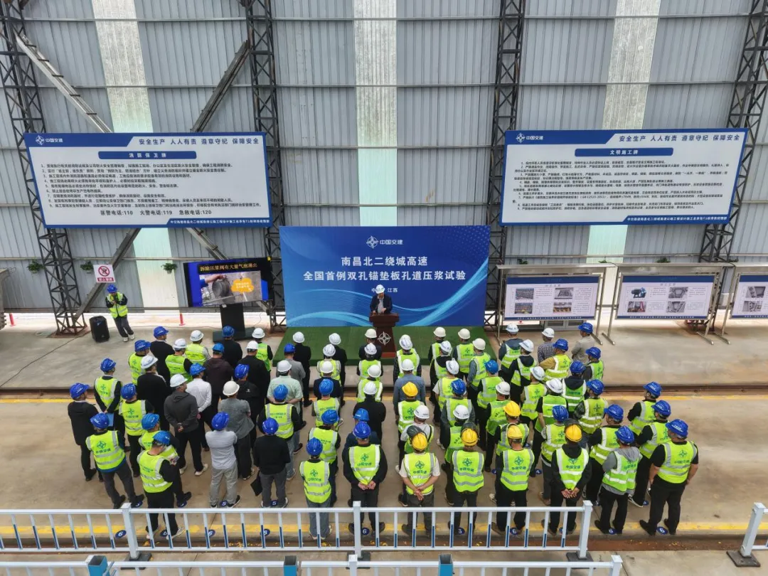 上午,关长禄专家在南昌北二绕高速项目T1标2号梁场组织开展了双孔锚垫板压浆试验活动。双孔锚垫板压浆工艺为全国首创。该创新工艺可显著提升孔道压浆饱满度与密实性,有效规避后期出现预应力损失情况的发生,增强桥梁结构耐久性和安全性。专家围绕双孔锚垫板压浆工艺原理、施工流程、关键控制要点等内容,与项目技术管理人员、一线作业人员进行深入交流。针对传统单孔压浆工艺易出现孔道压浆不饱满、空气残留、后期易出现预应力损失等问题,专家详细讲解了双孔锚垫板压浆“底孔压浆、上孔排气、不留死角” 的技术特点,对设备调试、构配件安装与使用、压力控制、稳压时长等关键环节进行细致实操指导。