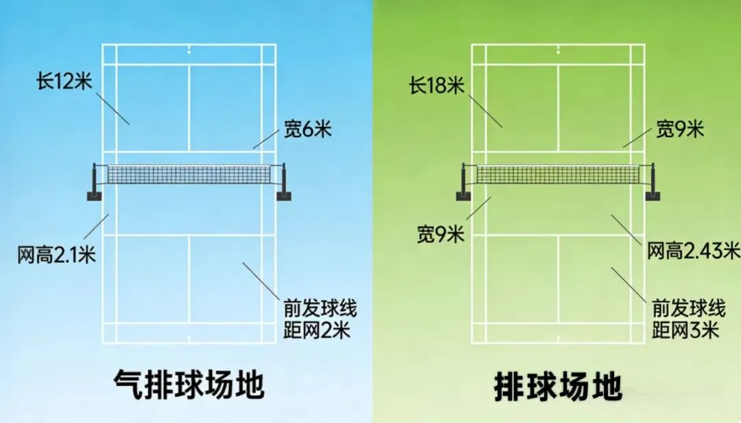 1984年,呼和浩特铁路局的老同志们用气球代替排球,在空地上拉网娱乐,意外开创了一项运动;如今,国家体育总局将其纳入全民健身计划,成为“健康中国”重点推广项目,全国锦标赛、社区赛、校园赛如火如荼。气排球的场地相比硬排球更小,比赛场地长13米,宽6米,由两个6X6米的方格拼接而成,中间的交界线为中线,距离中线两米处设置有限制进攻起跳点的限制线(也称2米线,距离中心线2米并与边线连接)。中心与限制线以内的地区为前场区向边线以外是无限延长的。场地所有界线宽为5厘米。