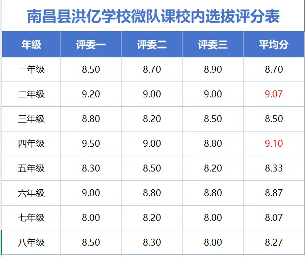 评委老师认真聆听、客观评分从课程内容、课堂表现、教育效果等方面综合评定各年级微队课最终成绩如下:
