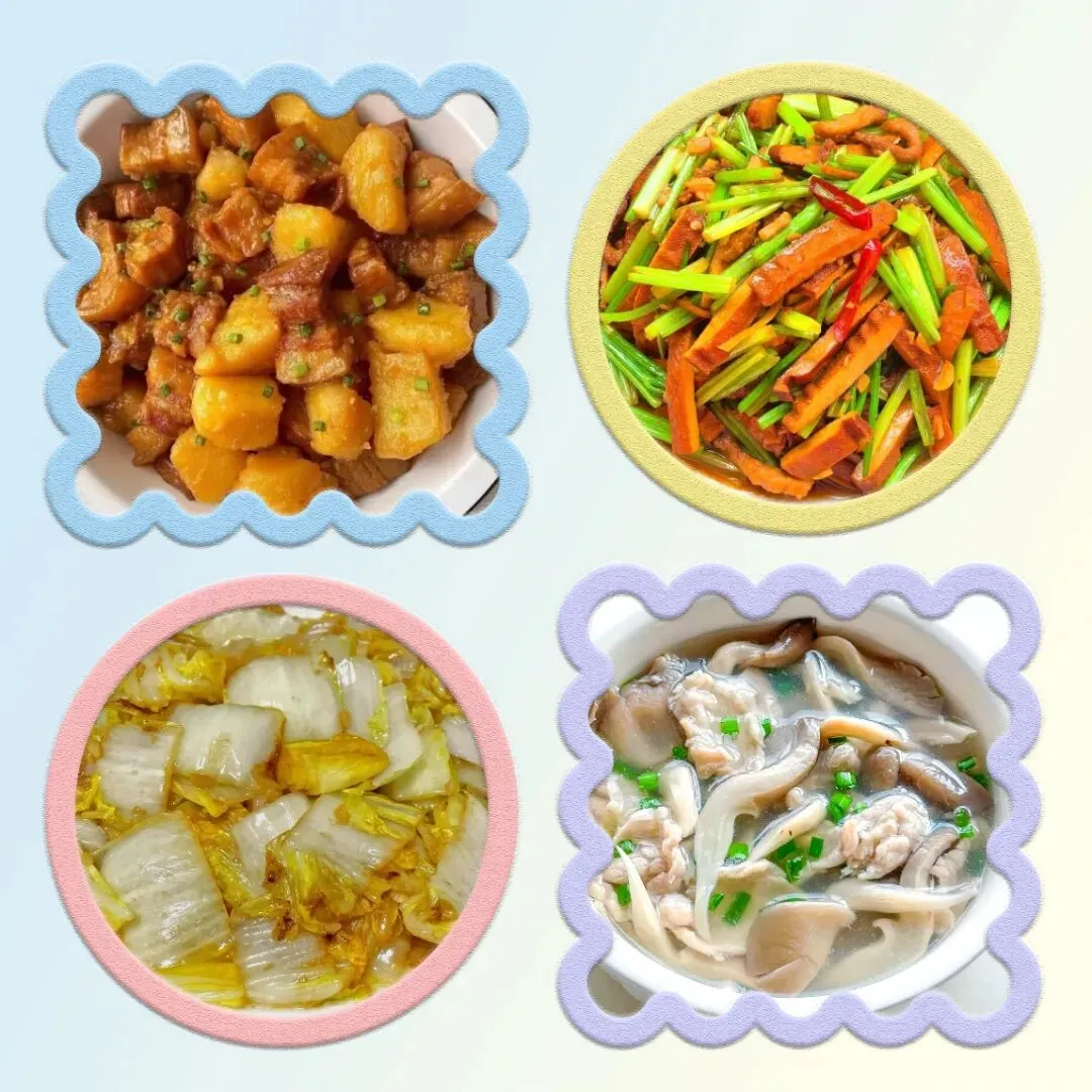 周一,土豆烧肉,芹菜香干,清炒娃娃菜,平菇肉丝汤。