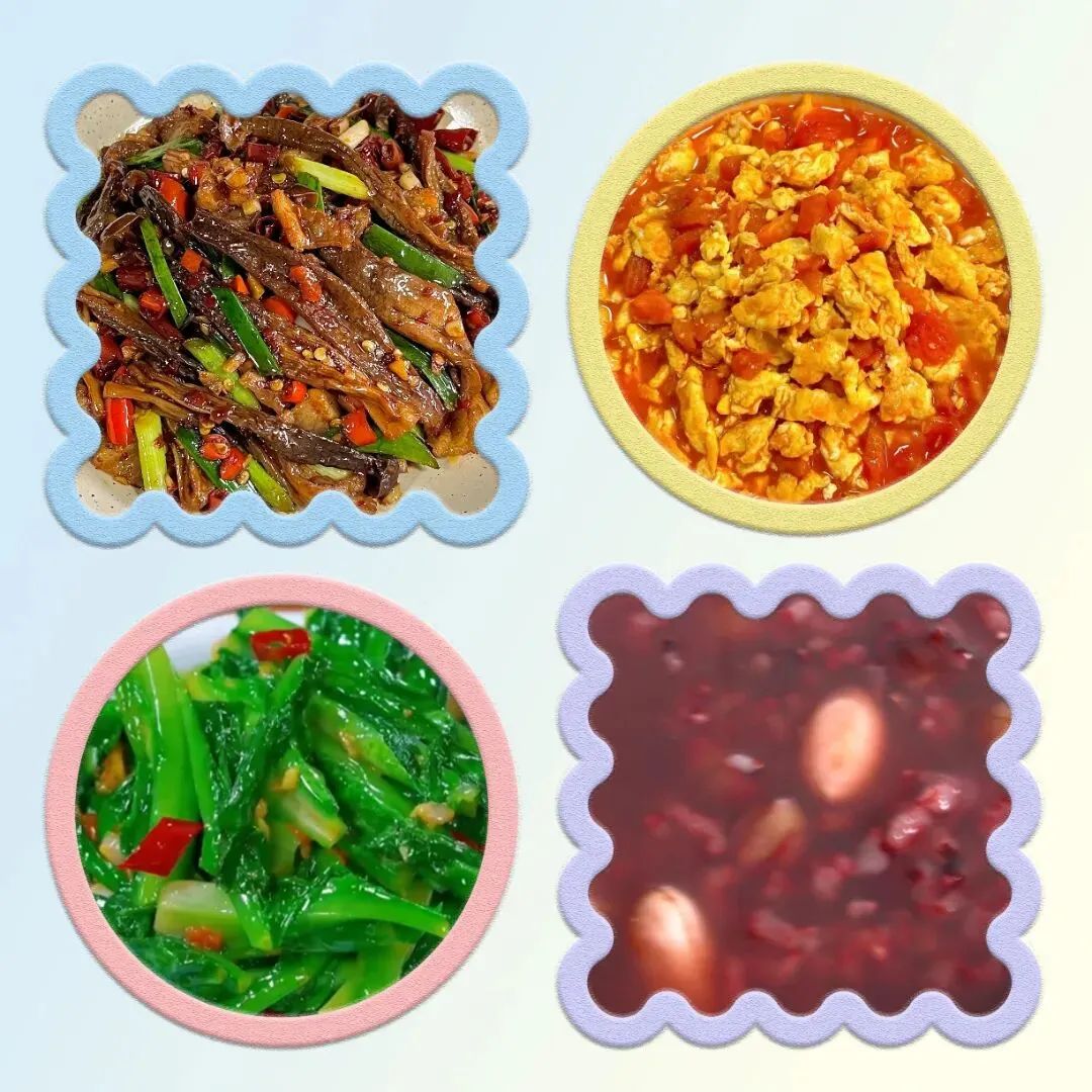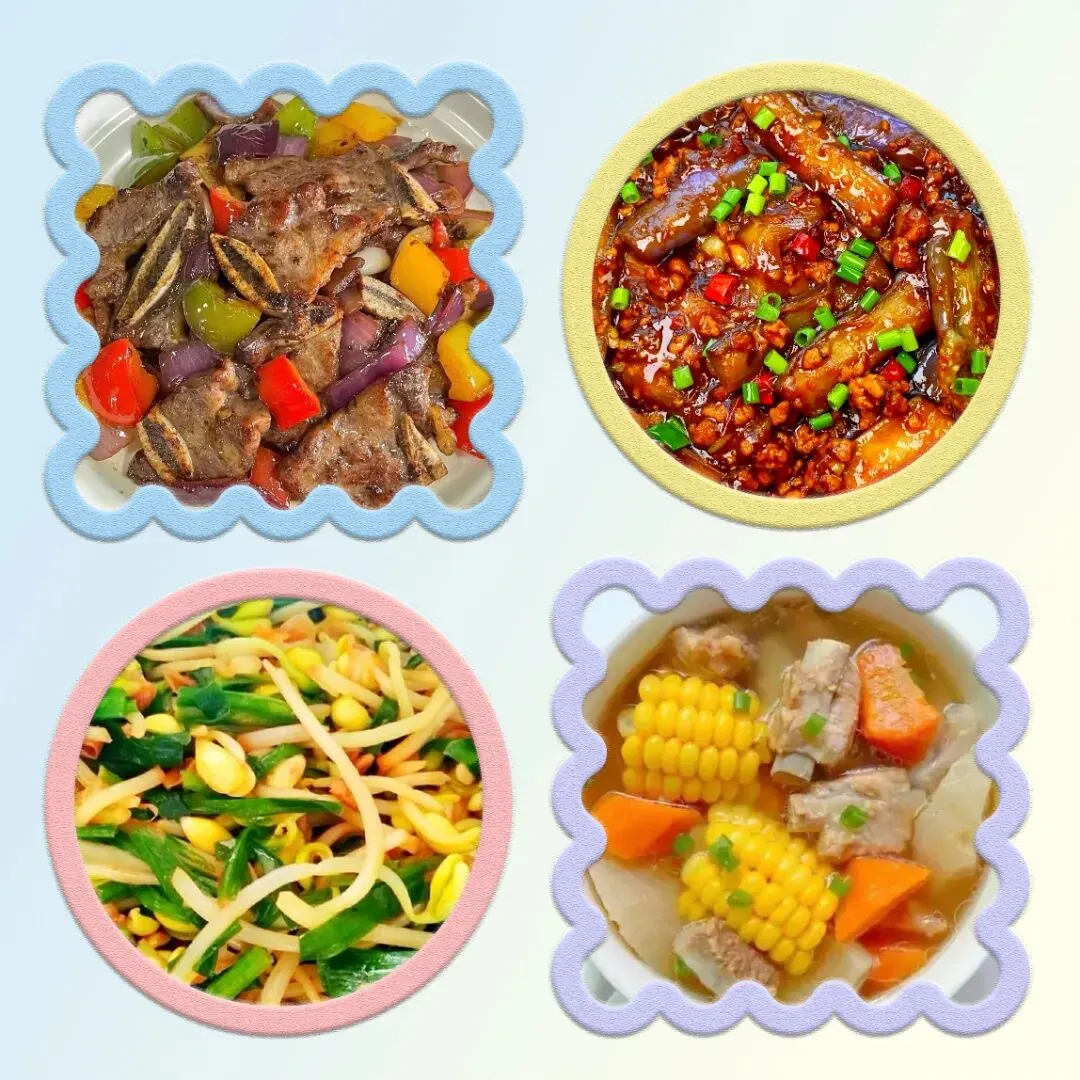周二,红烧牛仔骨,肉沫茄子,韭香银针,玉米排骨汤。