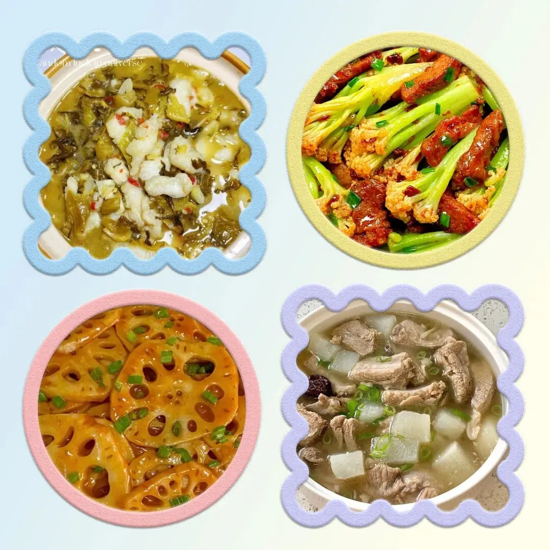 周四,酸菜巴沙鱼,花菜炒肉,泡椒藕片,冬瓜排骨汤。