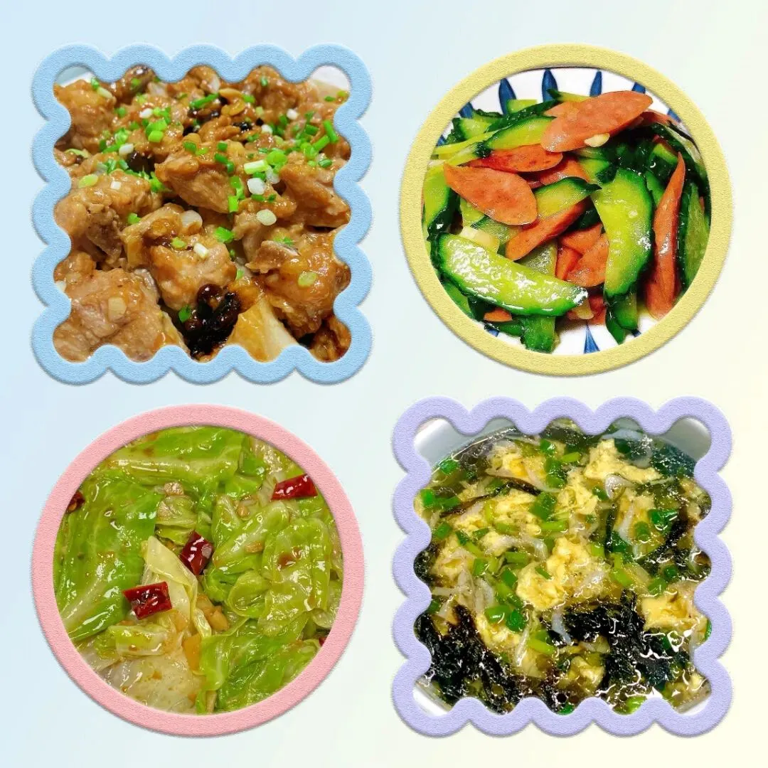 周五,芋头烧排骨,黄瓜火腿肠,手撕包菜,紫菜蛋汤。