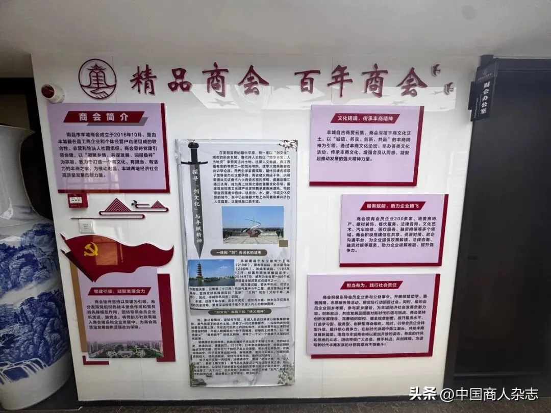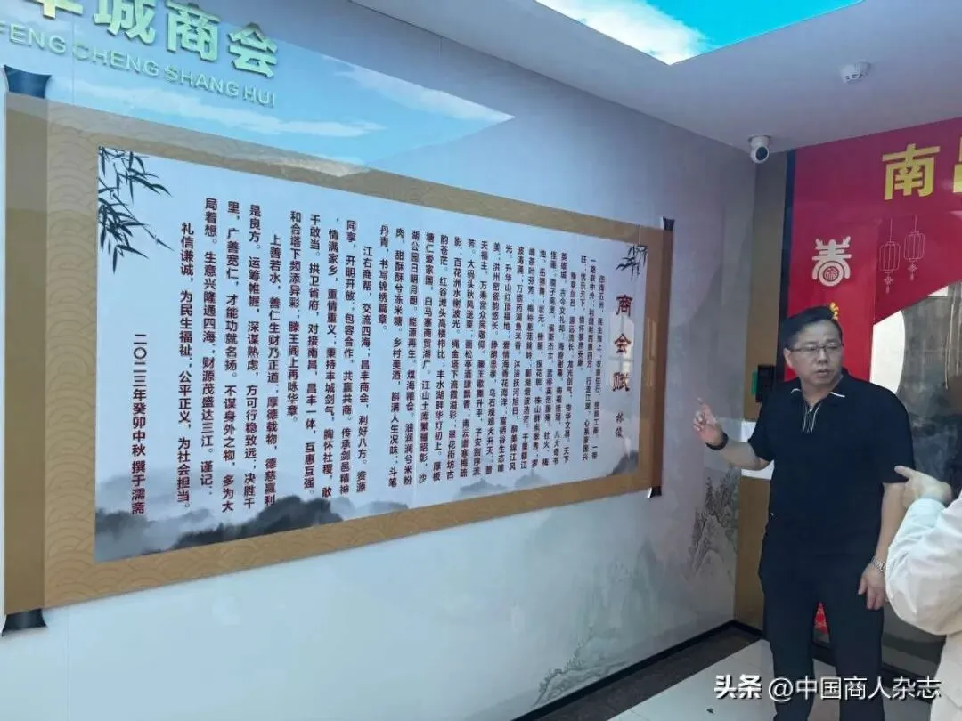 “一墙一文化,一景一初心”,商会文化墙成为专访组重点关注的亮点,其震撼的呈现效果让专访组成员印象深刻。李飞秘书长向专访组介绍,文化墙以图文并茂的形式,全景串联起丰城千年文脉与商会发展轨迹——从元代史学家、明代抗倭名将等丰城俊杰的家国情怀,到洪州窑瓷韵悠长、岳家狮舞非遗传承的文化底蕴,再到株山群岚翠秀、丰水湖畔华灯初上的地域风情,更有冻米糖的香甜、米粉塘的温润、梅峰茶叶的芬芳等丰城物产印记,连同商会成立以来的党建成果、公益善举、会员风采与发展成就,每一处细节都彰显着“诚信、务实、创新、共赢”的丰商精神,更镌刻着丰城人秉持剑邑剑气、刚毅果敢、仗义守信的“侠义精神”,这也是商会文化铸魂的核心所在,更是《商会赋》中“豫章剑邑,源远流长;龙光剑气,物华文昌”的生动诠释。