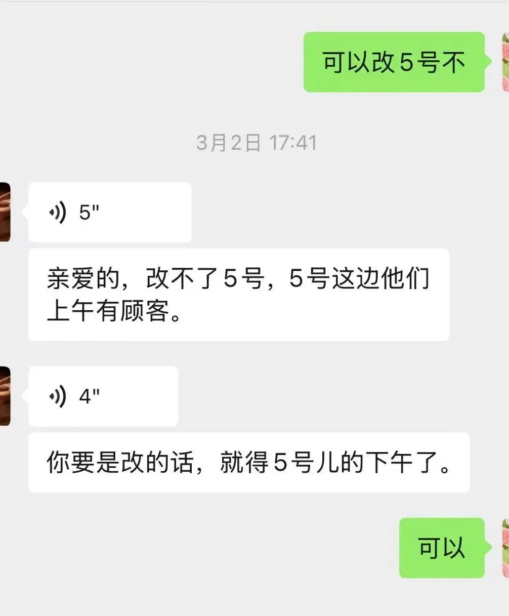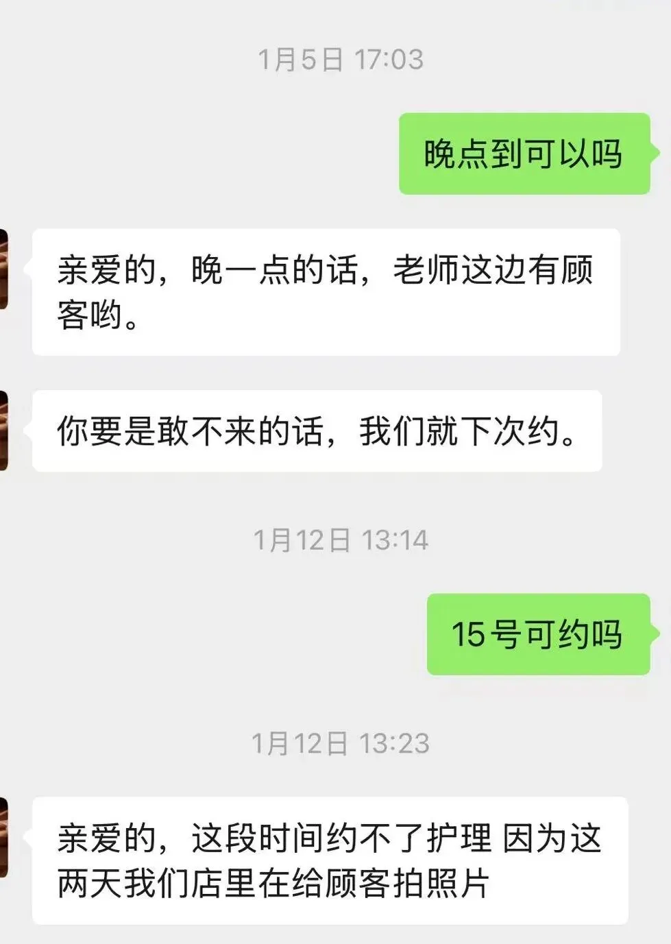 让她忍无可忍的,是今年的一次预约。“我提前约,他们说约满了,要再过三四天。到了现场,又说我给我安排男技师。”小陈觉得自己实在无法接受,便向店家提出退款。