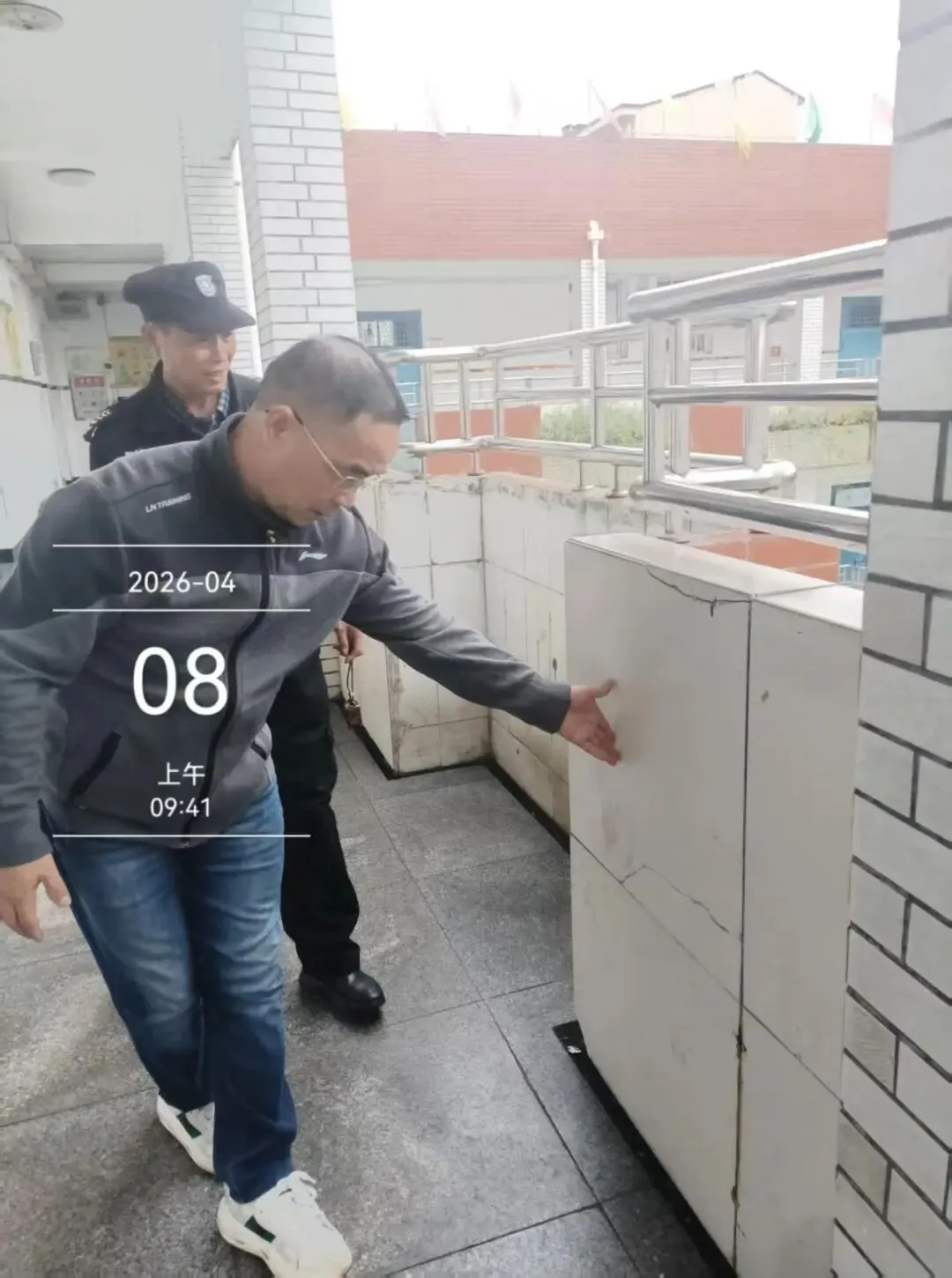 为切实保障全校师生生命财产安全,营造安全、稳定、有序的校园环境,2026年4月8日,南昌县莲塘第二小学副校长祝胜带领政保处工作人员及安保人员,开展校园安全隐患专项排查工作。重点聚焦消防设施、校舍栏杆、操场及恶劣天气防范等关键领域,做到“全覆盖、无死角、零遗漏”。