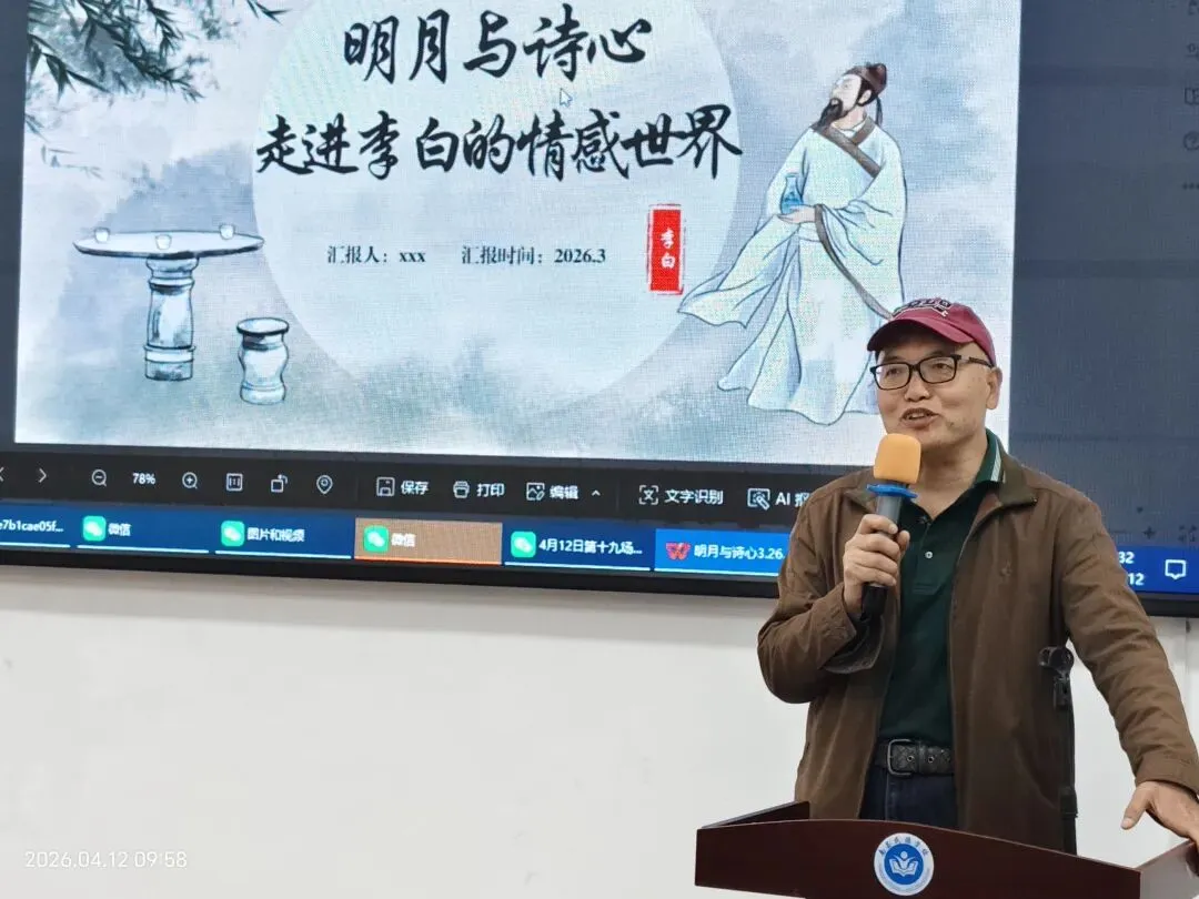 王会长长期从事诗词、辞赋的创作与研究,有诸多诗赋发表于《中华辞赋》等报刊,代表作《李太白诗传》。本次讲座纵览诗仙李白的人生历程,横观其与四位女性的情感交集,并以《寄东鲁二稚子》《梁园吟》等代表诗作为脉络,深度剖析了他的感情世界。李白诗中“双行桃树下,抚背复谁怜”所流露的拳拳父爱,与“东山高卧时起来,欲济苍生未应晚”中跌宕的济世情怀形成鲜明对照。