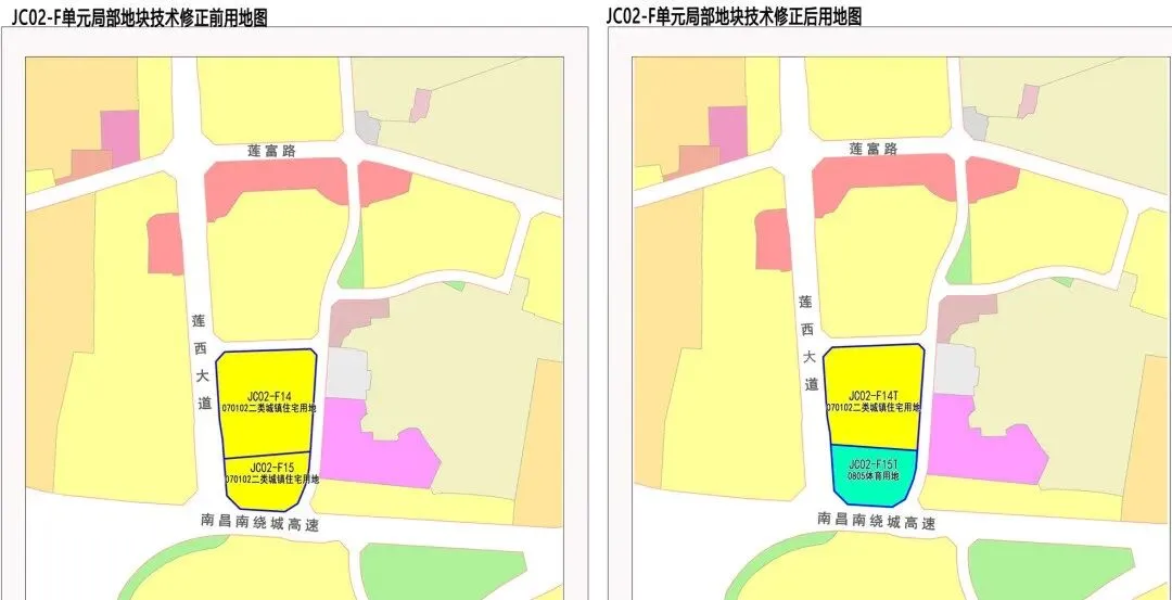 技术修正后JC02-F14T(二类城镇住宅用地),用地面积24229㎡,容积率2.2;JC02-F15T(体育用地),用地面积11155㎡,容积率≤0.6,建筑密度≤40%。
