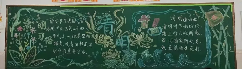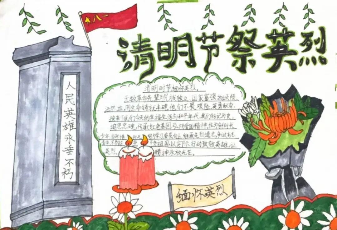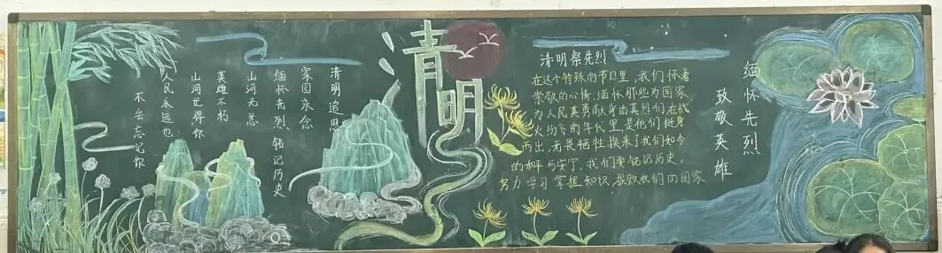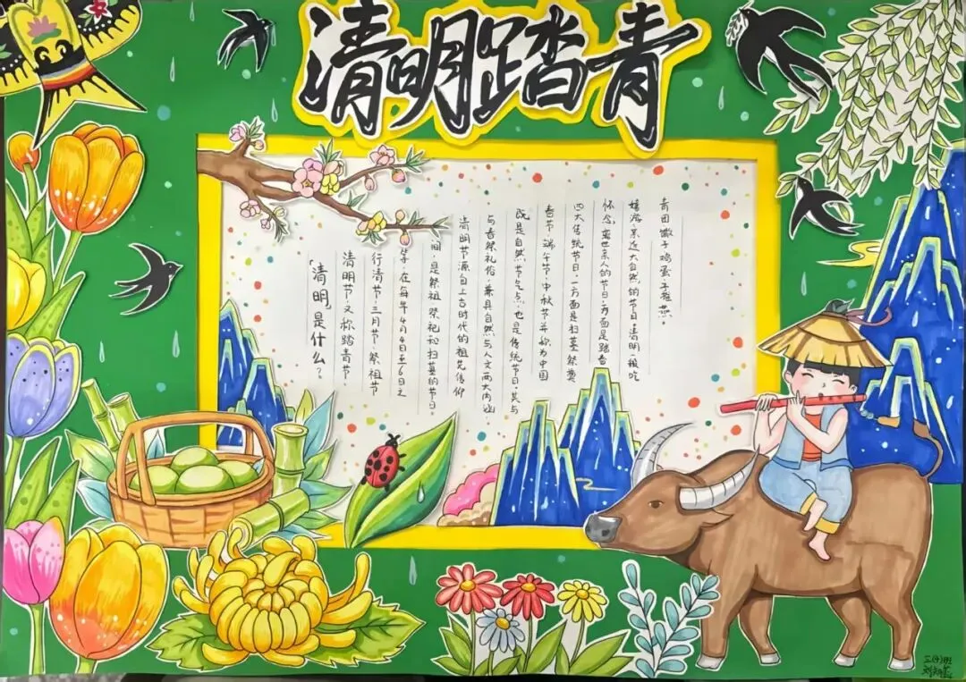 各班积极开展“清明祭英烈·文明树新风”板报、手抄报评比活动。同学们精心设计版面,用画笔描绘清明节传统习俗、英烈故事、绿色祭扫理念,将传统文化、红色教育与文明倡议融入作品之中。一幅幅主题鲜明、设计新颖、内容丰富的板报与手抄报,充分展现了学生对清明文化的理解和对文明祭扫的认同,营造出浓厚的节日文化与文明宣传氛围。