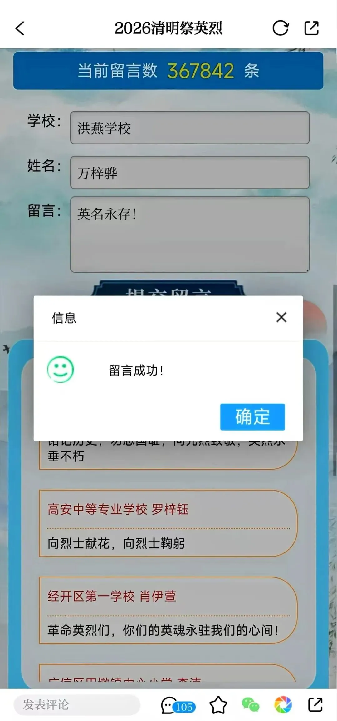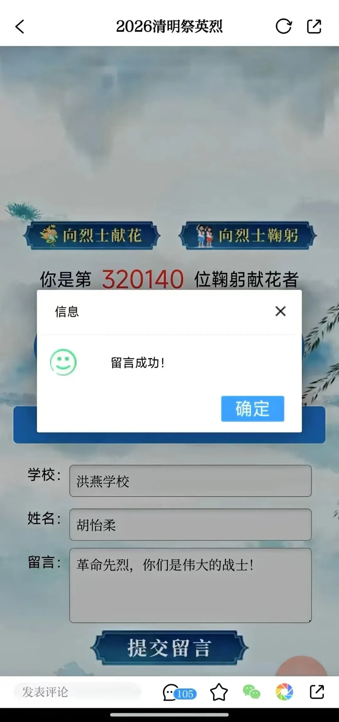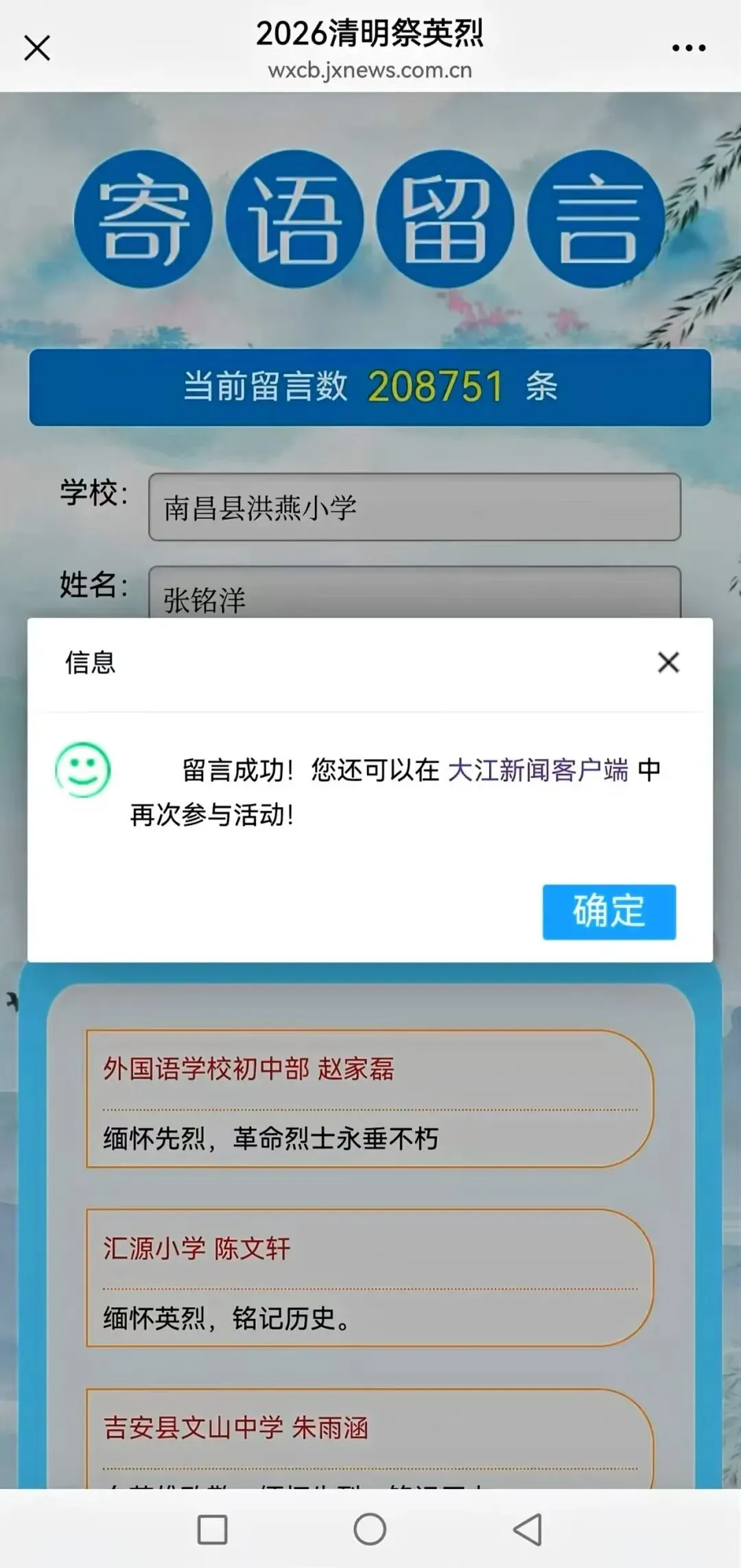 学校组织全体学生参与“网上祭英烈”活动,同学们登录文明祭扫平台,通过线上献花、点烛、签名、留言寄语等形式,向革命先烈、先贤先辈致以崇高敬意与深切缅怀。大家认真写下真挚感言,表达对英烈的追思与敬仰,在云端传承红色精神,厚植爱国主义情怀,以低碳环保、便捷庄重的方式完成追思仪式。