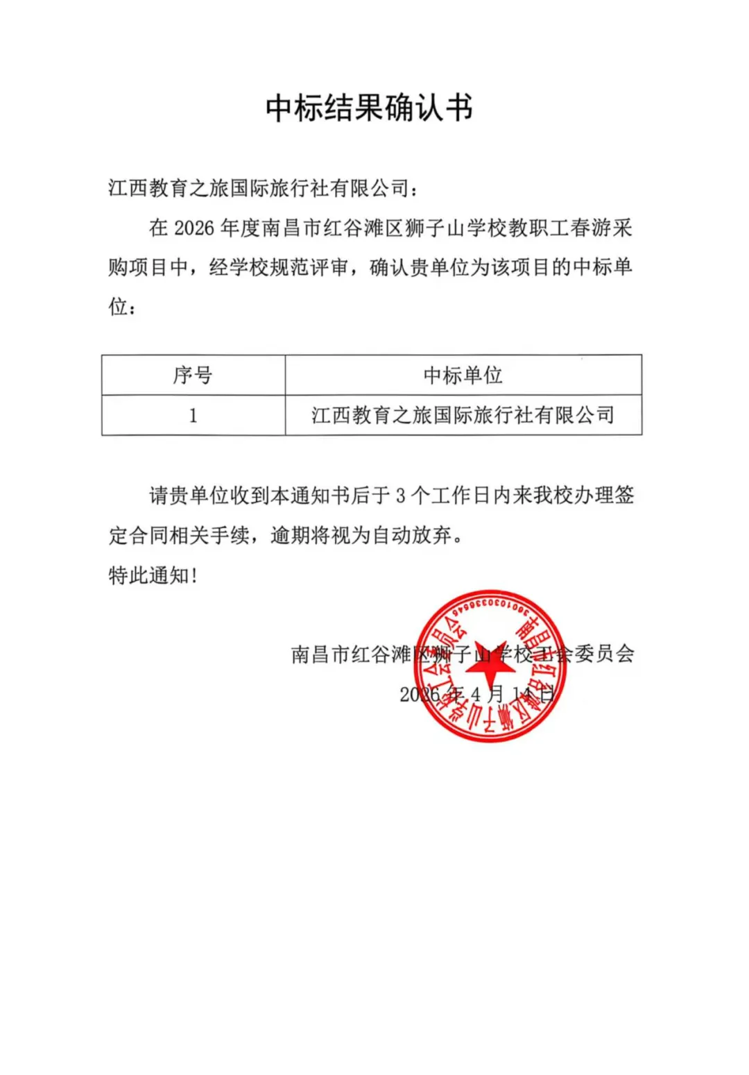 【狮子山·公告公示】关于南昌市红谷滩区狮子山学校2026年工会会员春游活动公开招标结果的公示