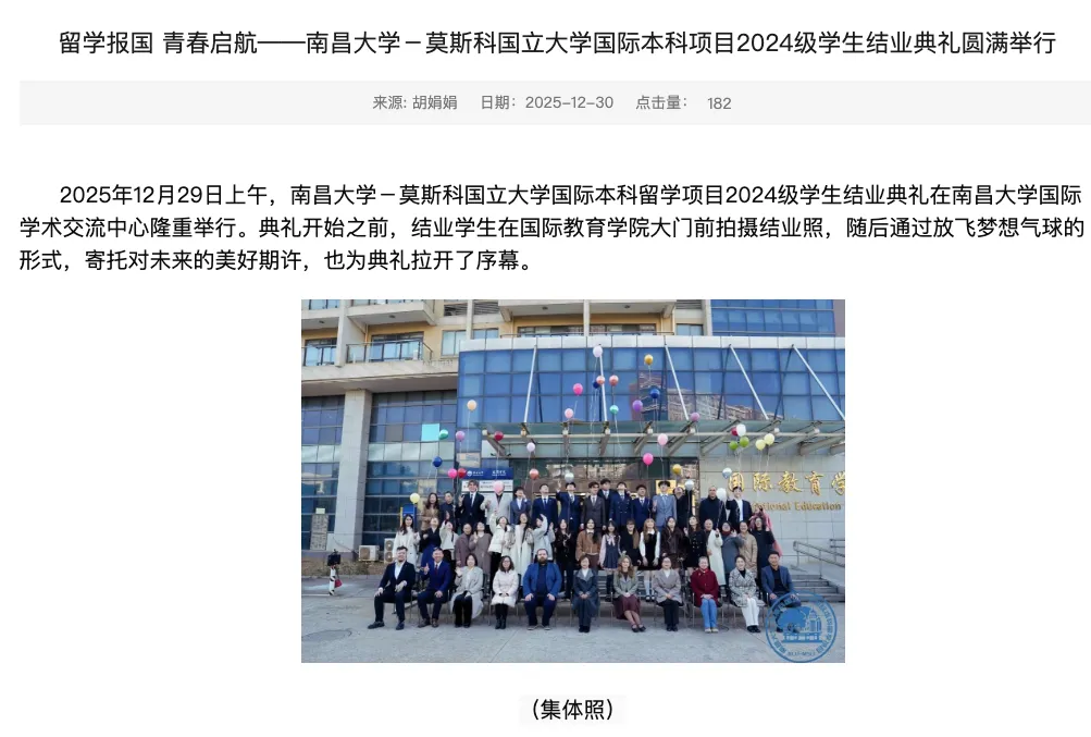 本项目学生前两年在南昌大学全日制学习语言课程(英语+俄语)、通识类课程、专业基础课程以及留学能力提升课程。顺利完成规定课程,达到莫斯科国立大学考核标准后,进入世界百强名校莫斯科国立大学完成后两年相应学位要求的其他课程的学习。成绩合格者将获得莫斯科国立大学相应学士学位,回国后可向中国(教育部)留学服务中心申请学位认证。
