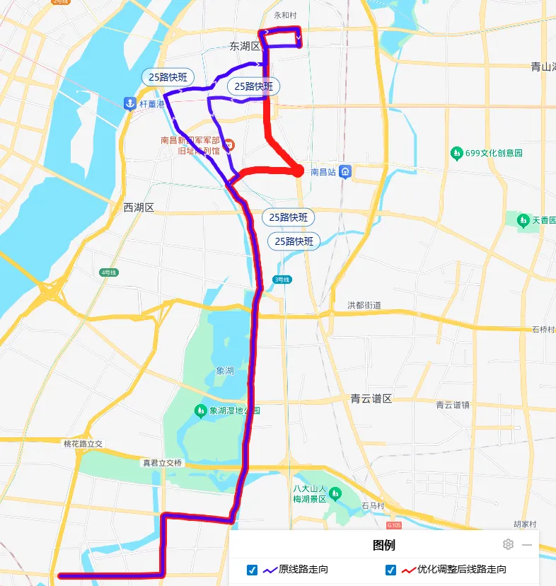 1.原线路走向东岳大道—金沙二路—八月湖路—金沙大道—施尧路—抚河南路—抚河中路—抚河北路—民德路—八一大道—阳明路;