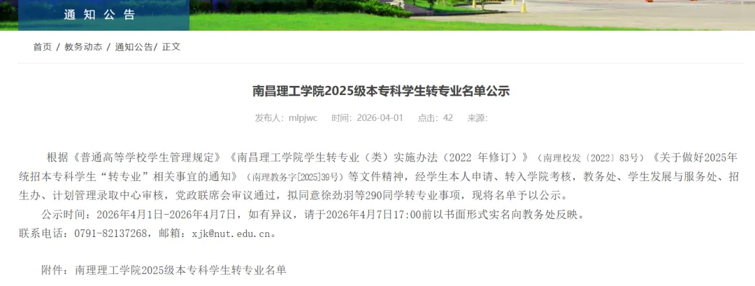 >290名!南昌理工学院2025级本专科学生转专业名单公示