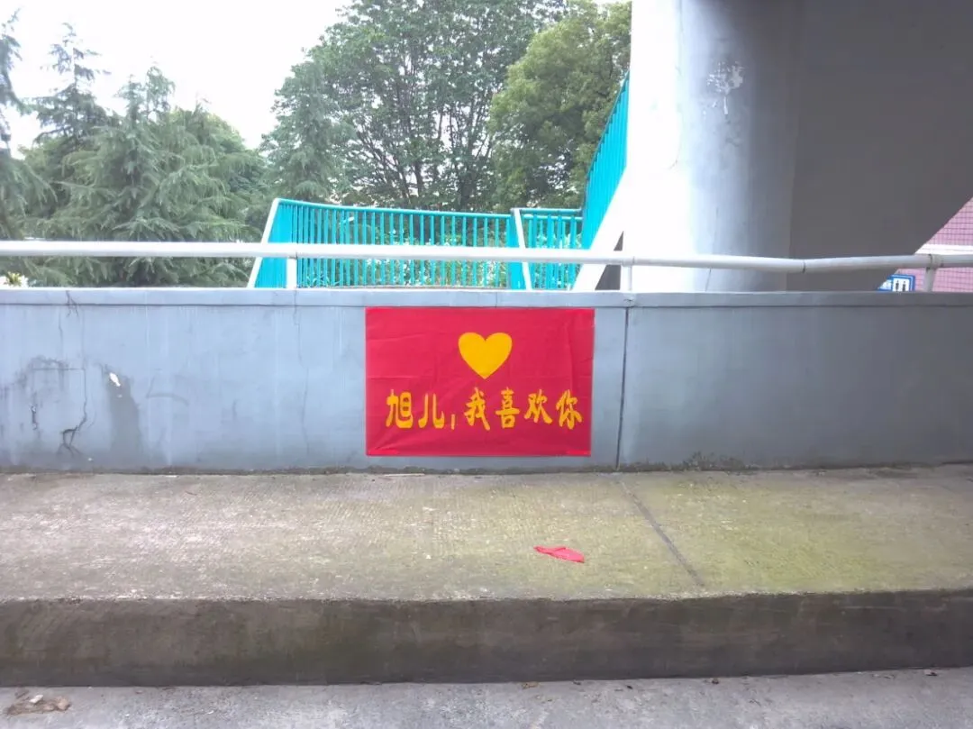 八一大桥非机动车道下桥螺旋道看到:旭儿,我喜欢你。大胆直白的表达。