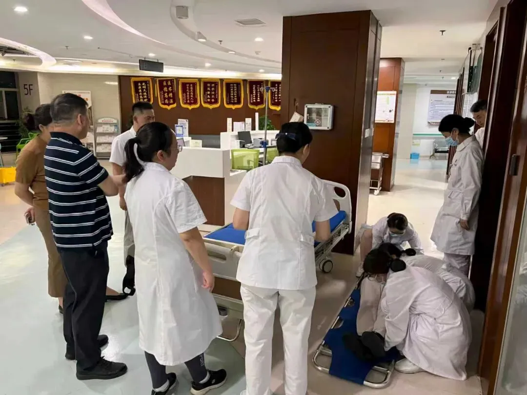 随后,检查组转战生殖科住院部,上演了一场“生死时速”——模拟患者在医生办公室门口突然心跳骤停倒地。值班医护闻讯立即奔赴现场,迅速组成急救团队,立即实施心肺复苏、准备除颤设备、建立静脉通路、快速转运,整个抢救过程紧张有序,体现了训练有素的应急能力和团队协作精神。