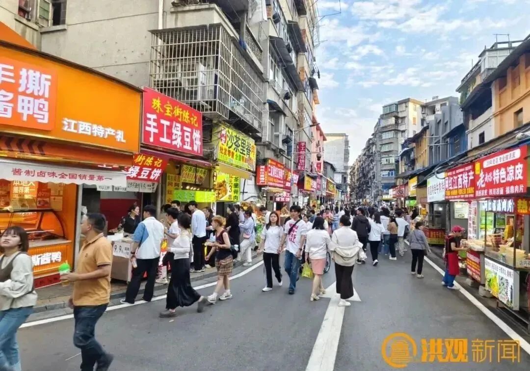 正午时分,珠宝街早已人声鼎沸,南昌炒粉、白糖糕、瓦罐汤等南昌特色小吃香气四溢,浓郁的烟火气扑面而来。尽管街区内游客很多,但现场秩序井然。