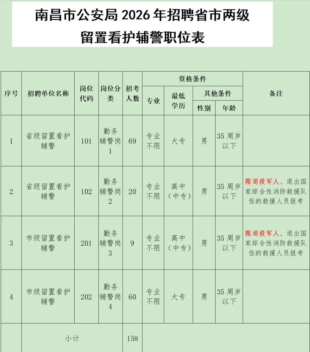 南昌市公安局2026年招聘省市两级留置看护辅警公告
