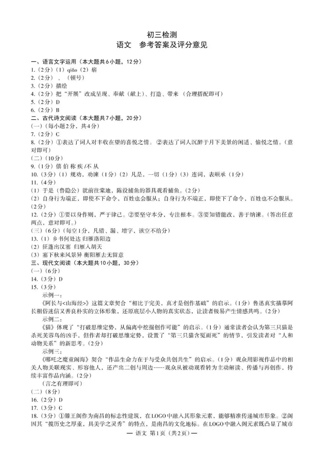 南昌初三一模语文题目及答案出来啦,大家看看难不难?