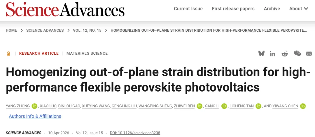 Yang Zhong et al. ,Homogenizing out-of-plane strain distribution for high-performance flexible perovskite photovoltaics.Sci. Adv.12,eaec3238(2026).